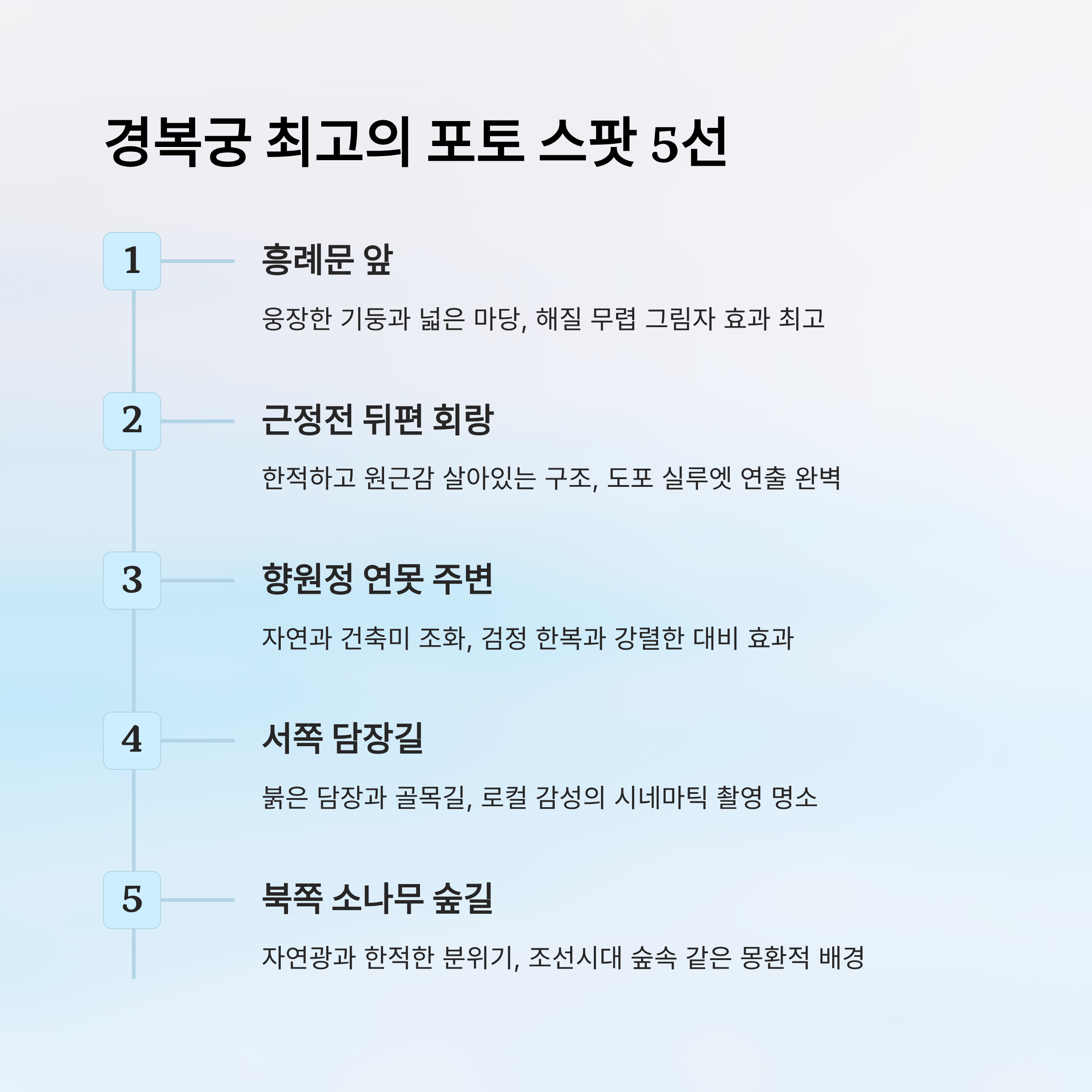 이제 모든 스타일링을 마쳤다면, 멋진 사진을 남길 차례예요! ‘케데헌’ 저승사자 한복은 고풍스러운 배경과 어울릴 때 진가를 발휘하죠. 경복궁은 그 자체로도 웅장하고 아름답지만, 특정 장소에서는 분위기가 정말 극적으로 달라져요. 지금부터 저승사자 스타일과 찰떡궁합인 경복궁 포토 스팟을 소개할게요! 📷
