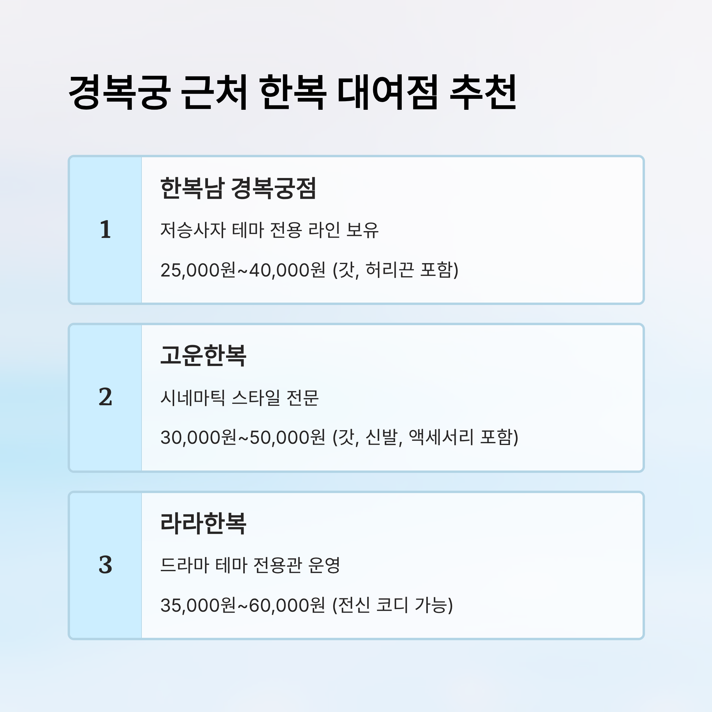 | 고운한복 | 광화문 근처 | 시네마틱 스타일 | 30,000원~50,000원 | 갓, 신발, 액세서리 포함 |
