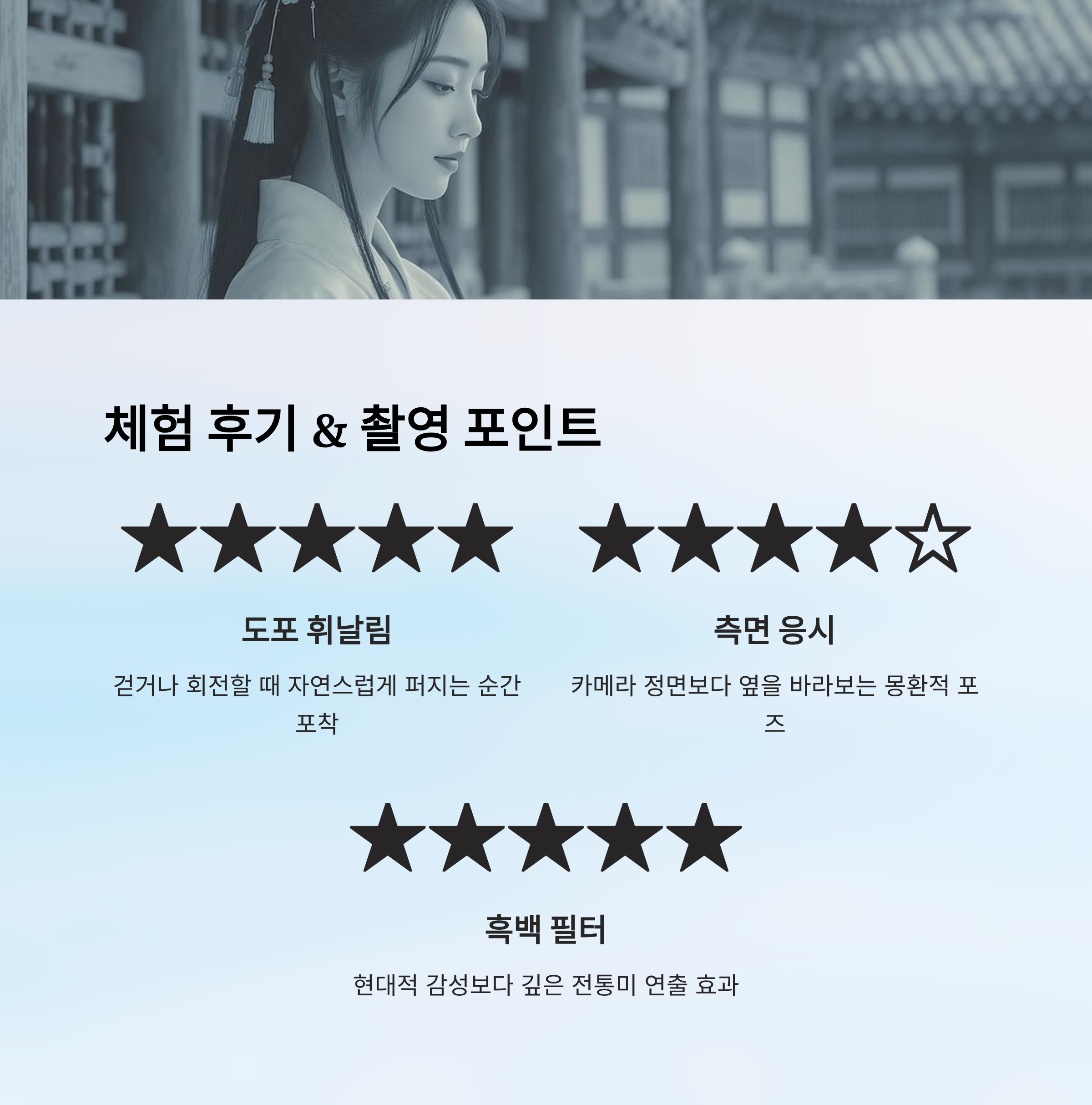 | 흑백 필터 | 현대적 감성보다 더 깊은 전통미 연출 | ★★★★★ |