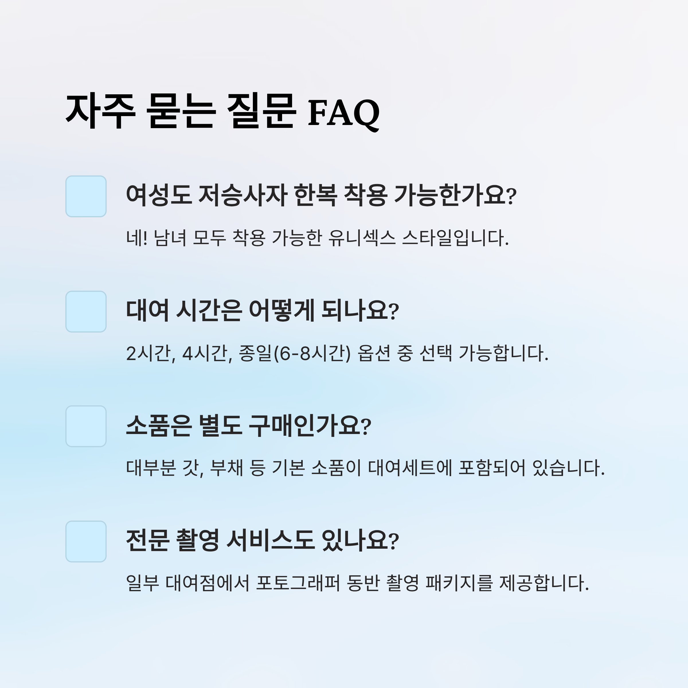 A2. 일반적으로는 2시간, 4시간, 종일 대여(6~8시간) 옵션이 있어요. 저승사자 스타일은 포토 촬영용으로 종일 대여하는 경우가 많고, 패키지마다 시간 구성이 달라요.