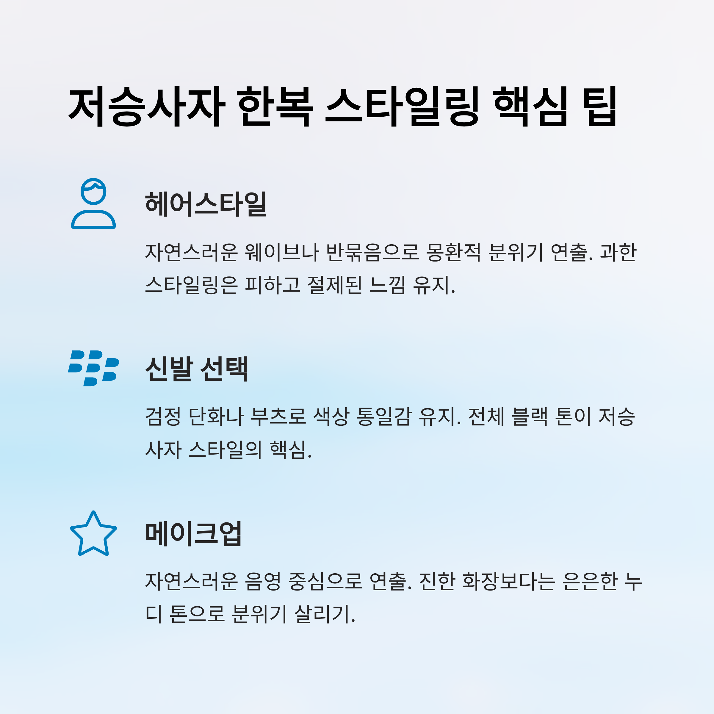 | 헤어 장식 | 비녀, 머리띠 등 포인트 | 블랙/실버톤 추천 |