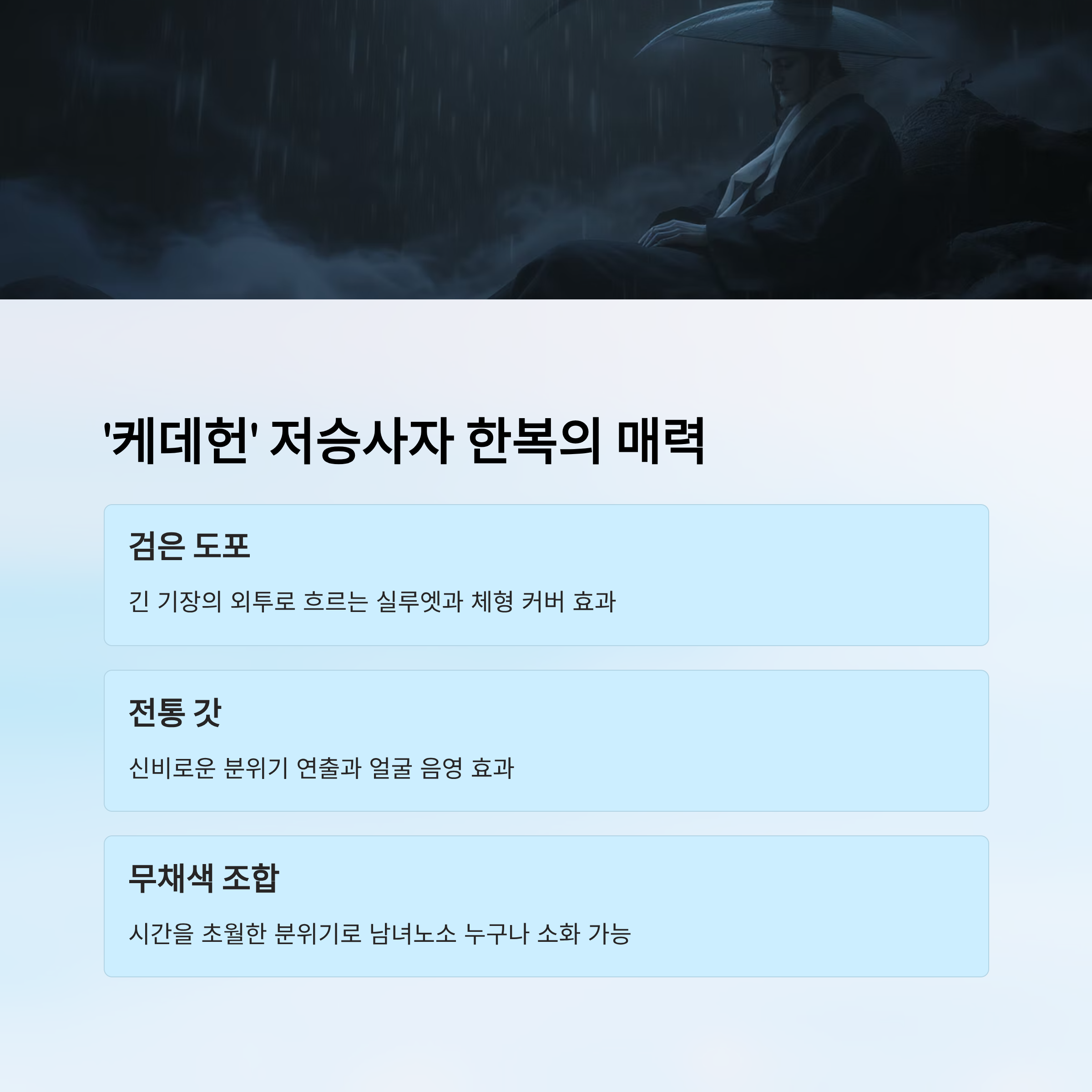 전통 의상이라고 해서 딱딱하게 느껴질 수 있지만, ‘케데헌’ 속 저승사자 한복은 오히려 몽환적인 느낌을 강조해줘요. 특히 어두운 배경이나 고궁 같은 장소에서 사진을 찍으면 영화 같은 컷을 얻을 수 있어서 SNS에서도 큰 인기를 끌고 있어요.