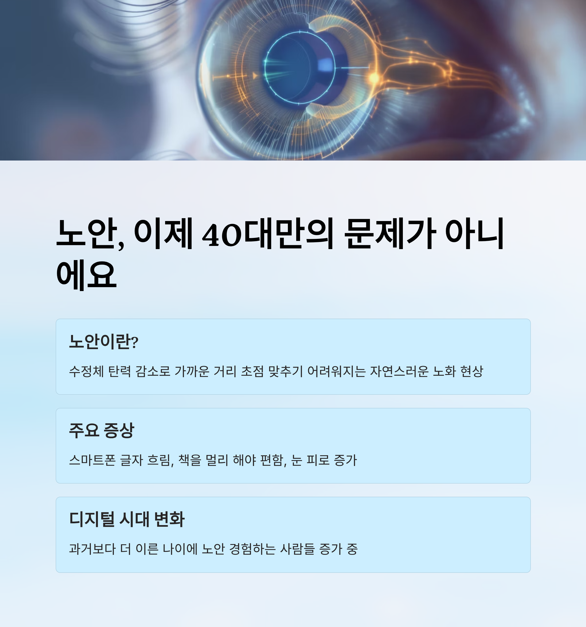 노안은 보통 40세 이후부터 자연스럽게 찾아오는 시력 변화예요. 우리 눈 속 수정체가 점점 탄력을 잃으면서 가까운 거리를 볼 때 초점을 맞추기 어려워지는 증상이죠. 노안은 누구에게나 찾아오며, 회피할 수 있는 것이 아니라 '관리'가 핵심이에요.