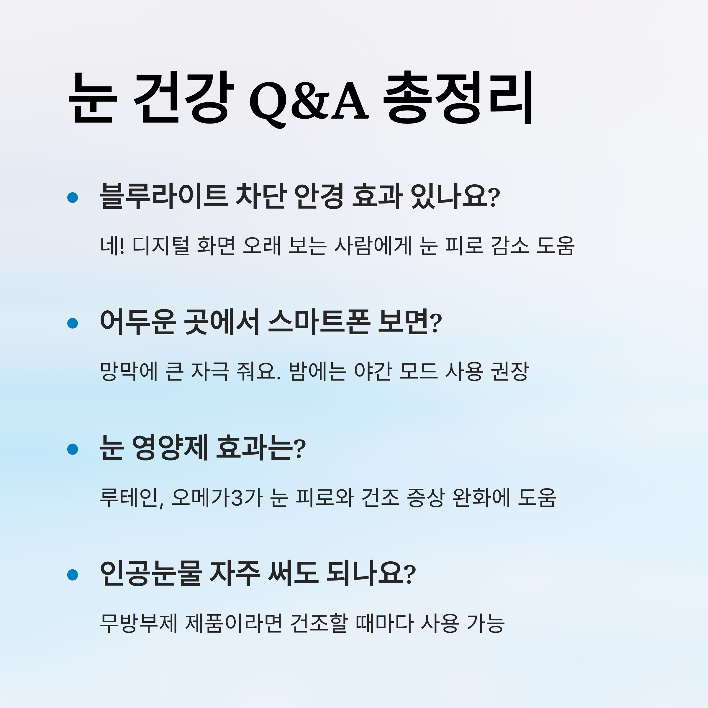 | 블루라이트 | 망막 세포 손상 | 눈 시림, 피로 | 차단 필터 사용 |