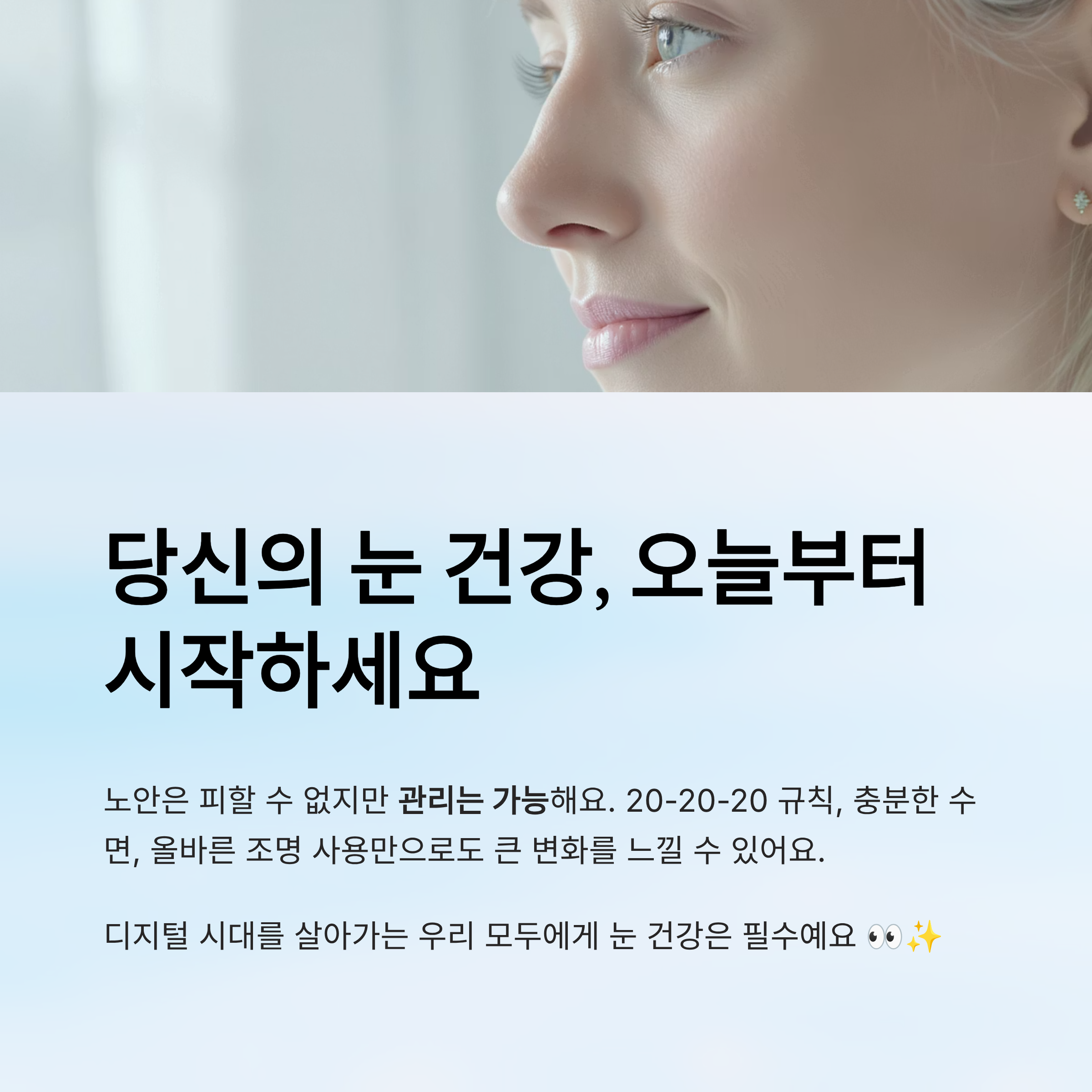 노안을 단순히 '나이 탓'으로 넘기기보다는, 생활습관을 개선하고 예방 중심으로 접근해야 해요. 그러면 노안의 진행 속도를 줄이고, 일상 속에서 눈의 편안함을 오래 유지할 수 있답니다 😊