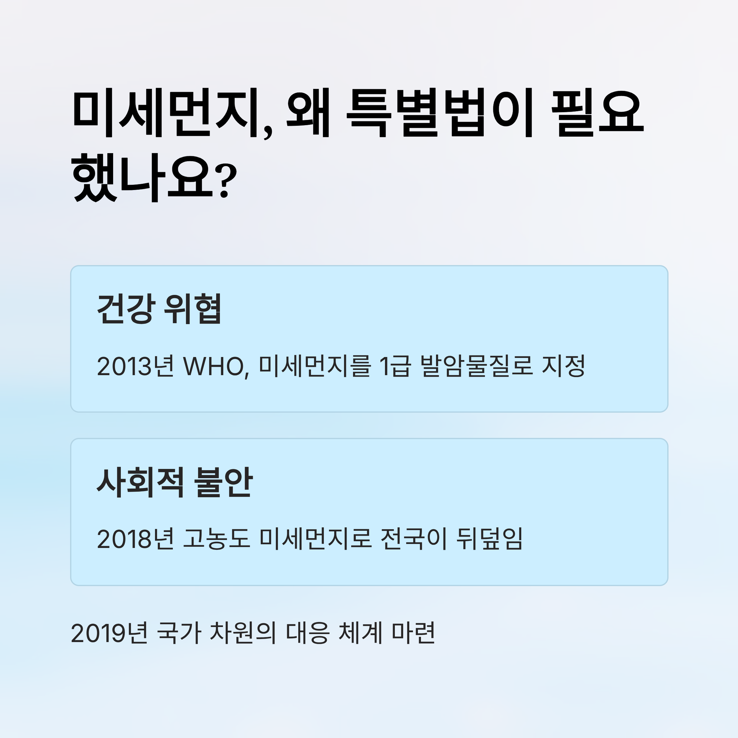 미세먼지는 호흡기 질환, 심혈관 질환을 유발할 만큼 심각한 건강 문제를 일으킵니다. 2013년 WHO는 미세먼지를 1급 발암물질로 지정했고, 국내에서도 사회적 파장이 커졌습니다. 특히 2018년 고농도 미세먼지로 전국이 뒤덮이자 국민들의 불안이 최고조에 달했습니다. 이러한 배경 속에서 2019년 「미세먼지 특별법」이 제정·시행되며 국가 차원의 대응 체계가 마련되었습니다.