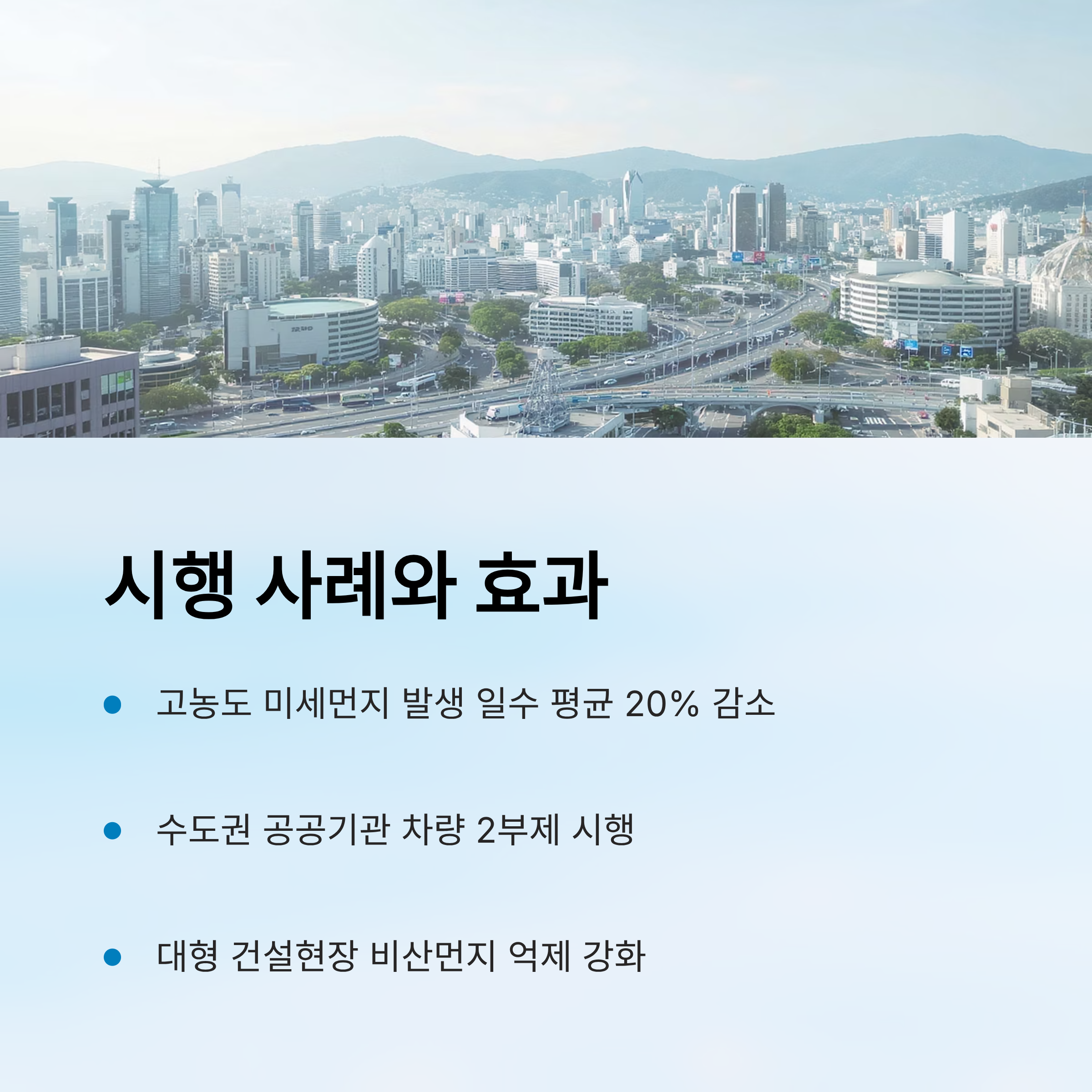 법이 시행된 이후 여러 사례가 있었습니다. 2020년 봄에는 고농도 미세먼지가 발생하자 수도권에서 비상저감조치가 발령되어 공공기관 차량 2부제가 실시되었습니다. 또한 대형 건설현장에서는 비산먼지 억제 장비 설치가 강화되었고, 일부 발전소는 가동률을 줄였습니다.