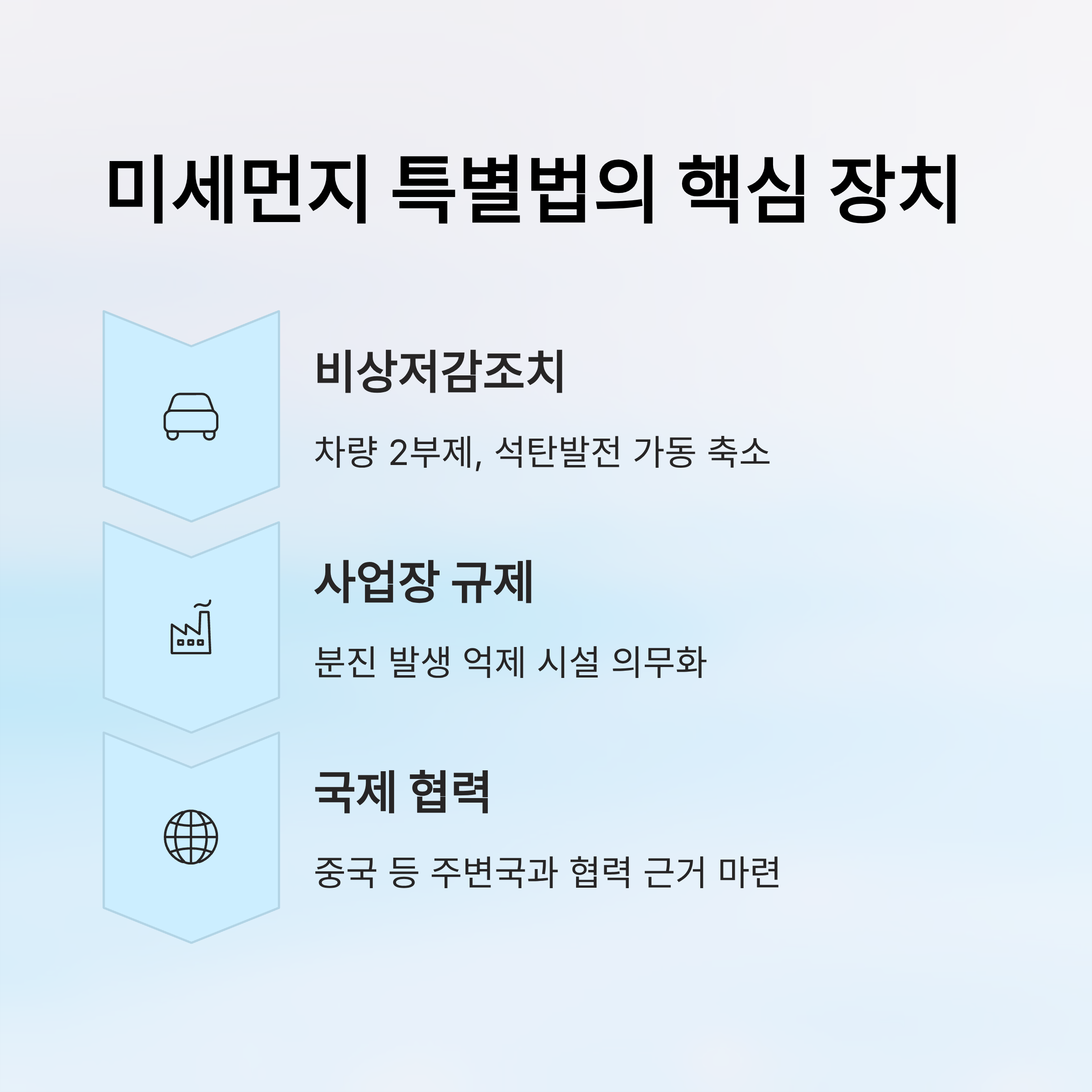 이 법은 크게 세 가지 핵심 장치를 담고 있습니다. 첫째, 고농도 미세먼지 비상저감조치로 차량 2부제, 공공기관 차량 운행 제한, 석탄발전 가동 축소 등이 포함됩니다. 둘째, 사업장·건설현장 규제로 분진 발생 억제 시설 설치 의무화와 배출 기준 강화가 있습니다. 셋째, 국제 협력 조항으로 중국 등 주변국과의 협력 근거도 포함되었습니다.
