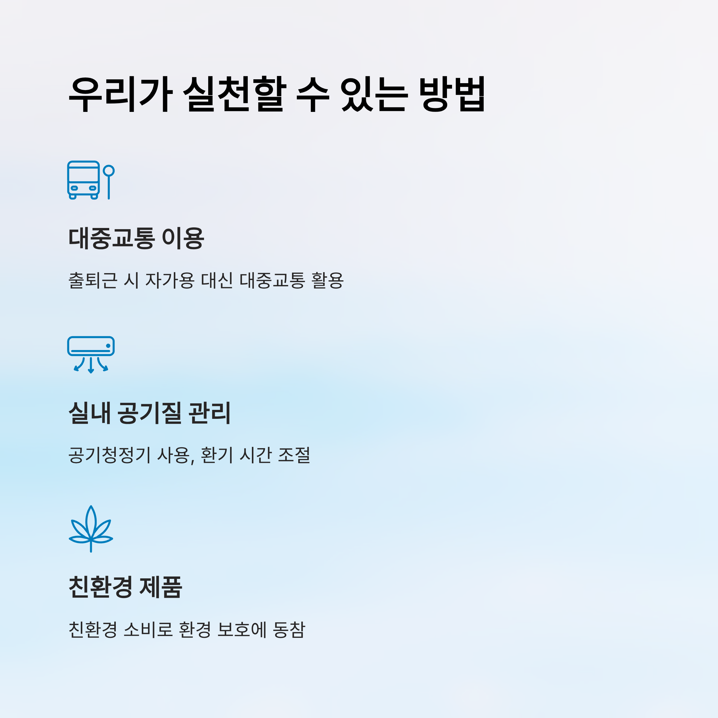 저는 최근 출퇴근 시 대중교통을 주로 이용하고, 사무실에서는 공기청정기를 함께 사용하는 작은 변화를 실천하고 있습니다. 사소해 보이지만 이러한 노력이 모이면 큰 힘이 될 수 있습니다.