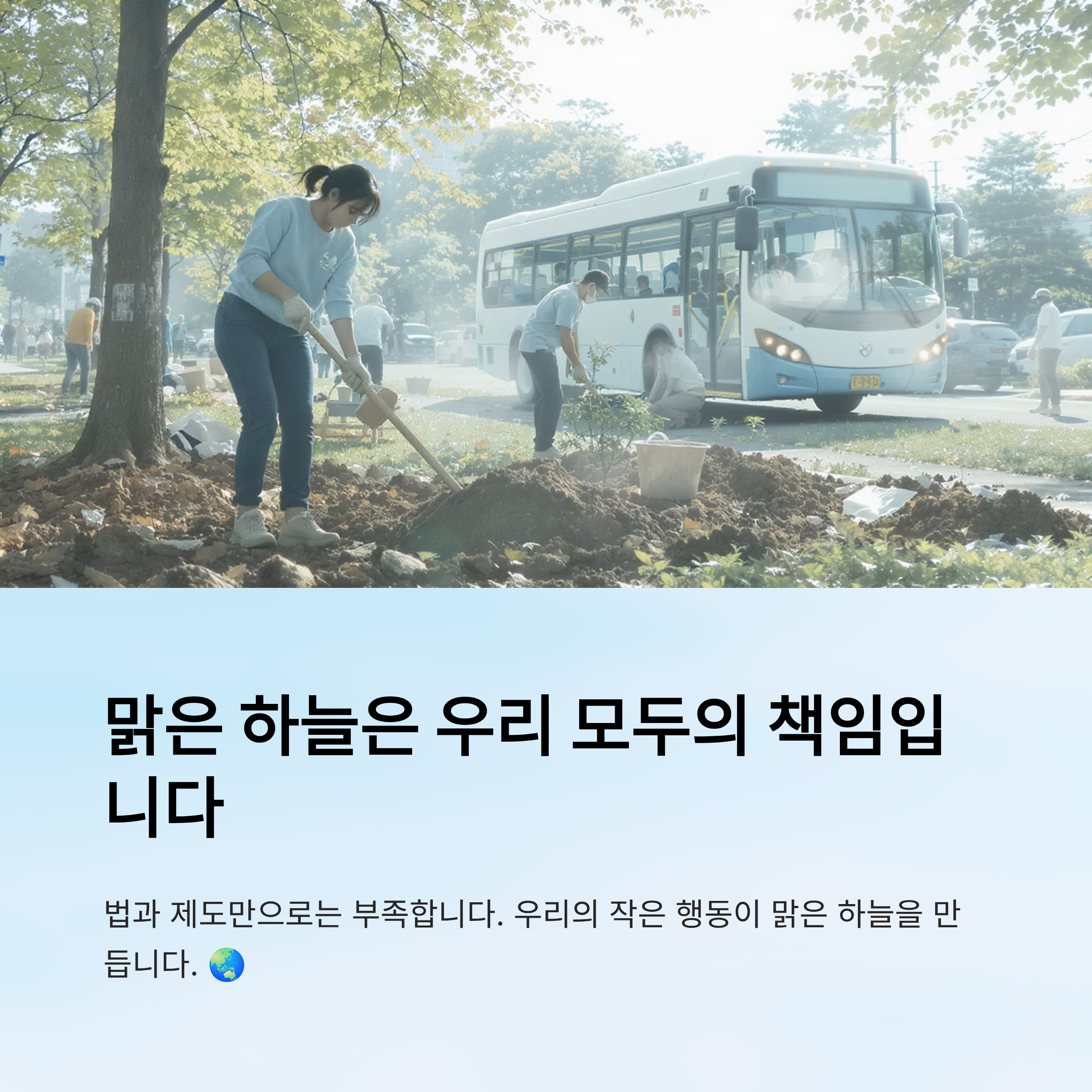 마무리하자면, 「미세먼지 특별법」은 국가적 차원에서 공기 질 개선을 위한 중요한 첫걸음입니다. 하지만 제도만으로는 부족하며, 개인과 기업, 국제 협력이 함께 이루어져야 실질적 성과가 나타날 것입니다. 우리 모두의 작은 실천이 더 맑은 하늘을 만드는 시작입니다. 🌏