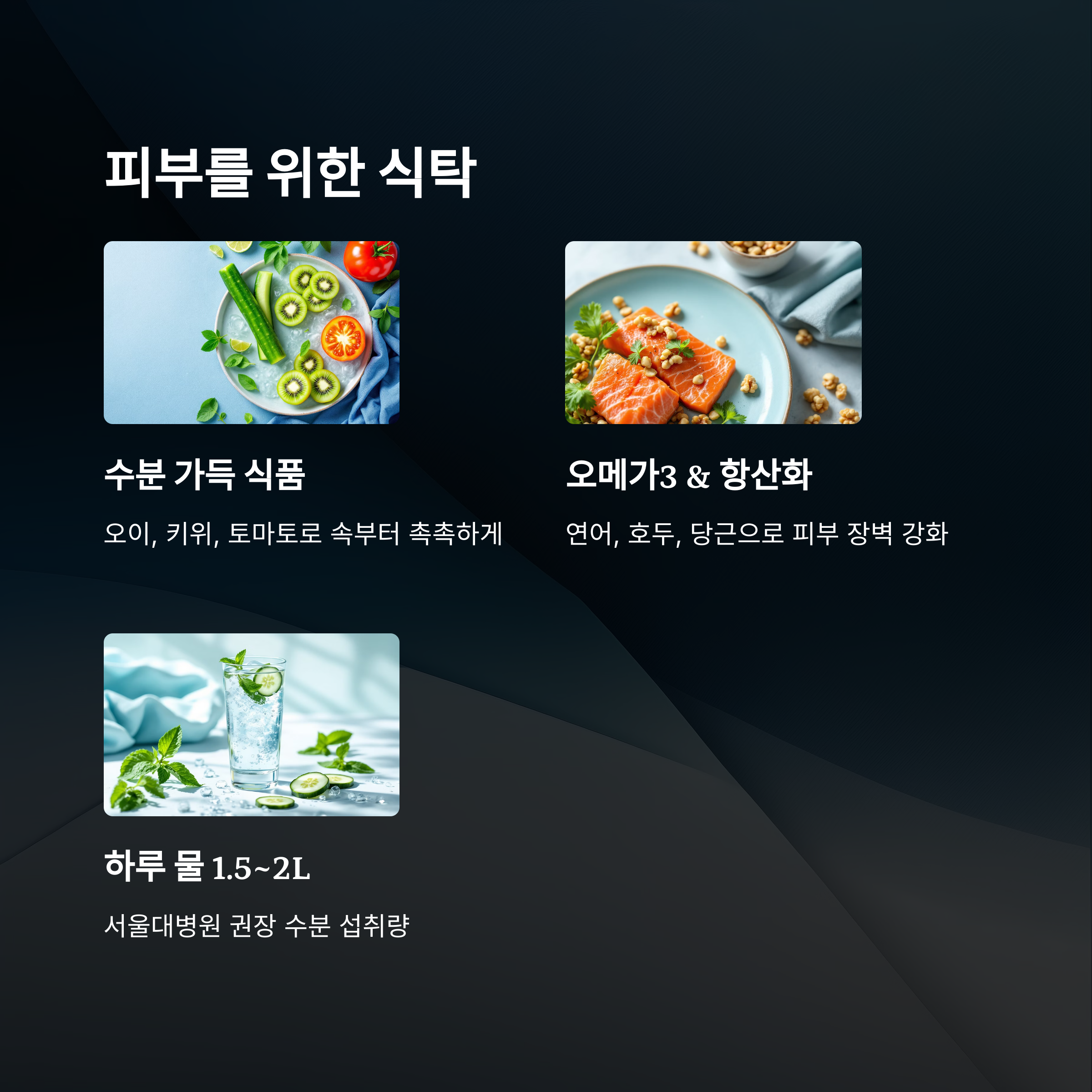 하루 2L의 수분을 꾸준히 마시는 것만으로도 피부 속까지 촉촉해지고, 트러블도 눈에 띄게 줄어들어요. 내 피부는 내가 먹는 것과 함께 만들어진답니다. 🍽