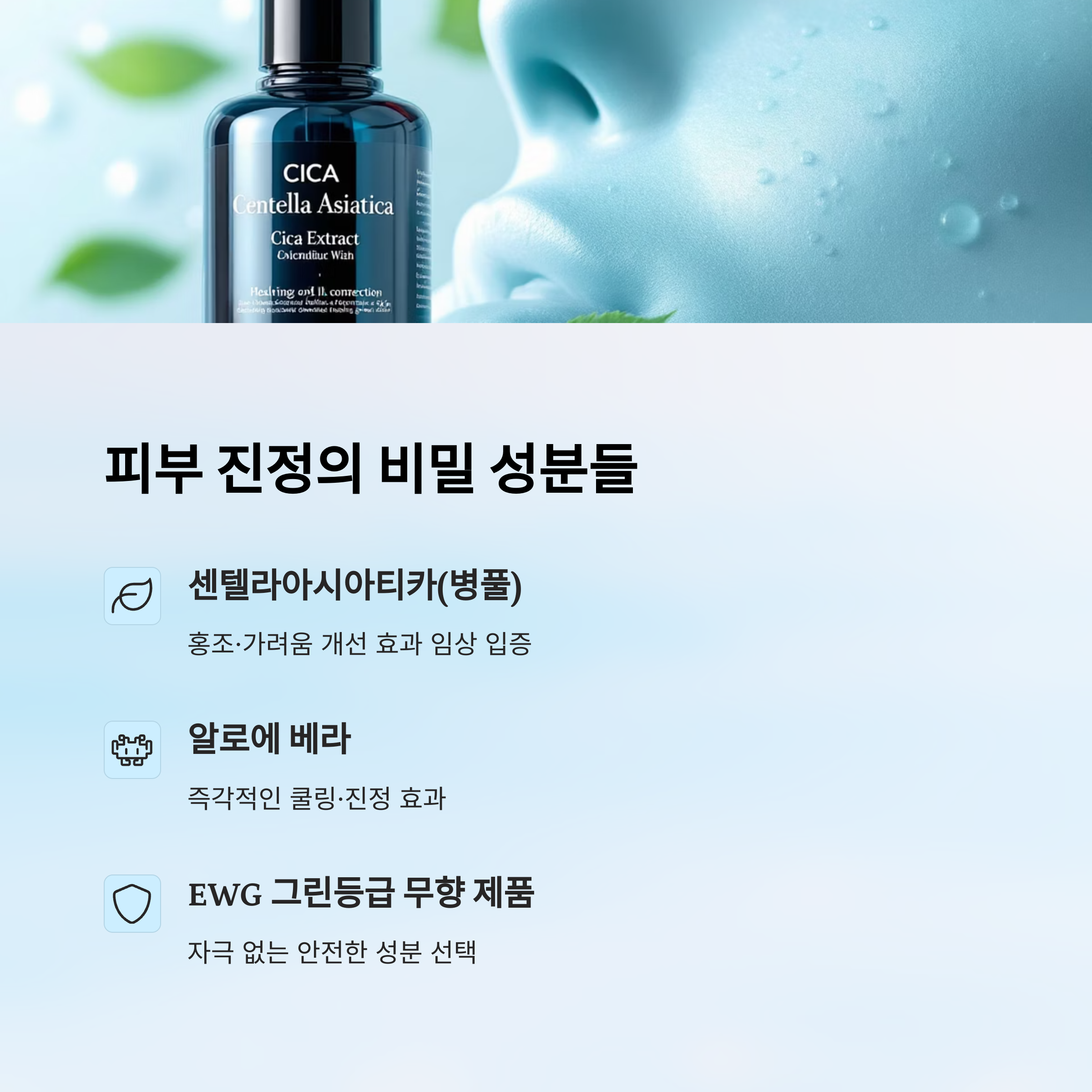 대표적인 진정 성분으로는 ‘센텔라 아시아티카(병풀 추출물)’, ‘알란토인’, ‘카모마일’, ‘마데카소사이드’ 등이 있어요. 이 성분들은 자극받은 피부를 부드럽게 진정시키고 장벽 회복을 도와준답니다.