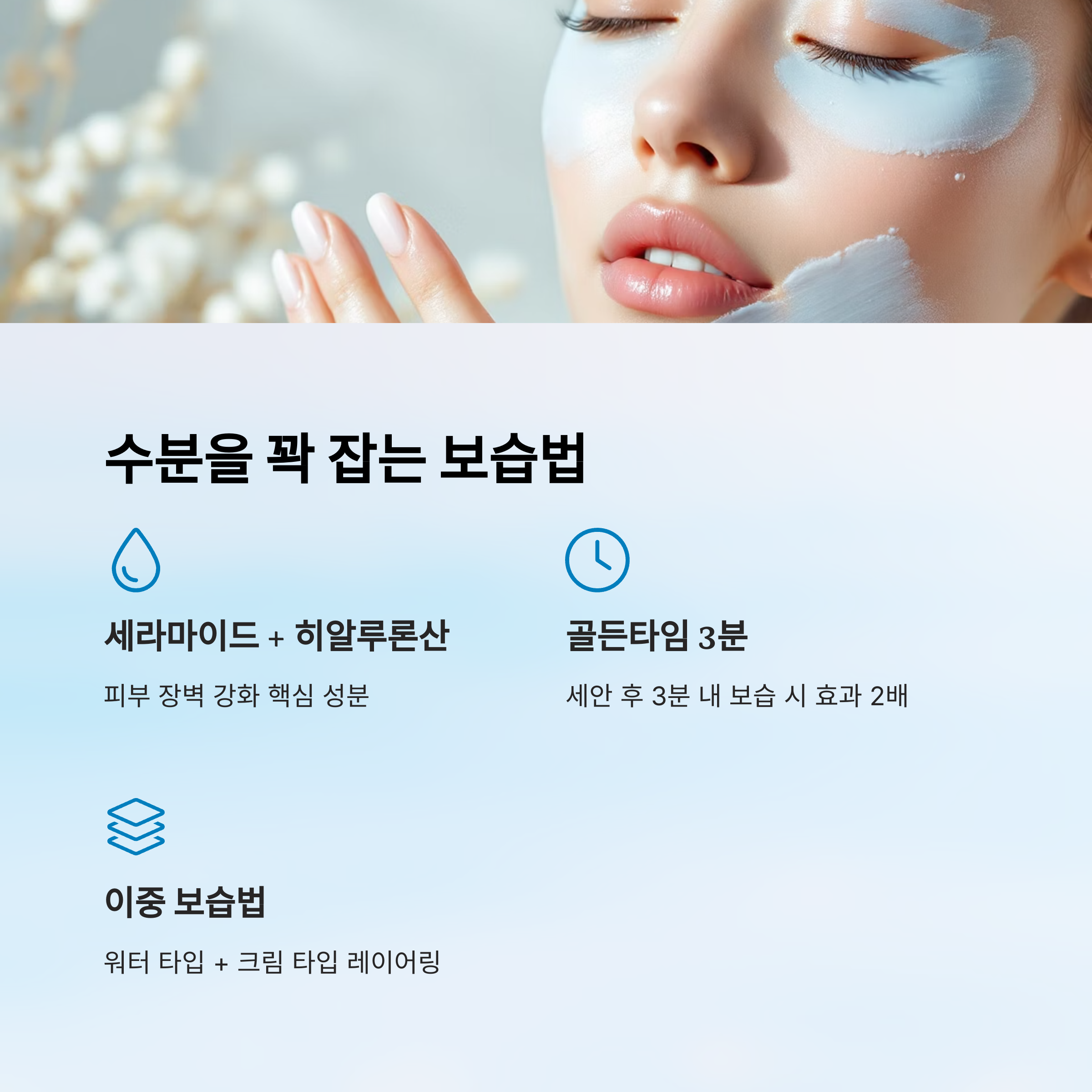 수분크림을 고를 때는 알코올이나 인공향이 없는, 무향 저자극 제품을 선택하는 게 좋아요. 그리고 보습제는 세안 후 3분 이내에 발라야 수분 증발을 최소화할 수 있어요.