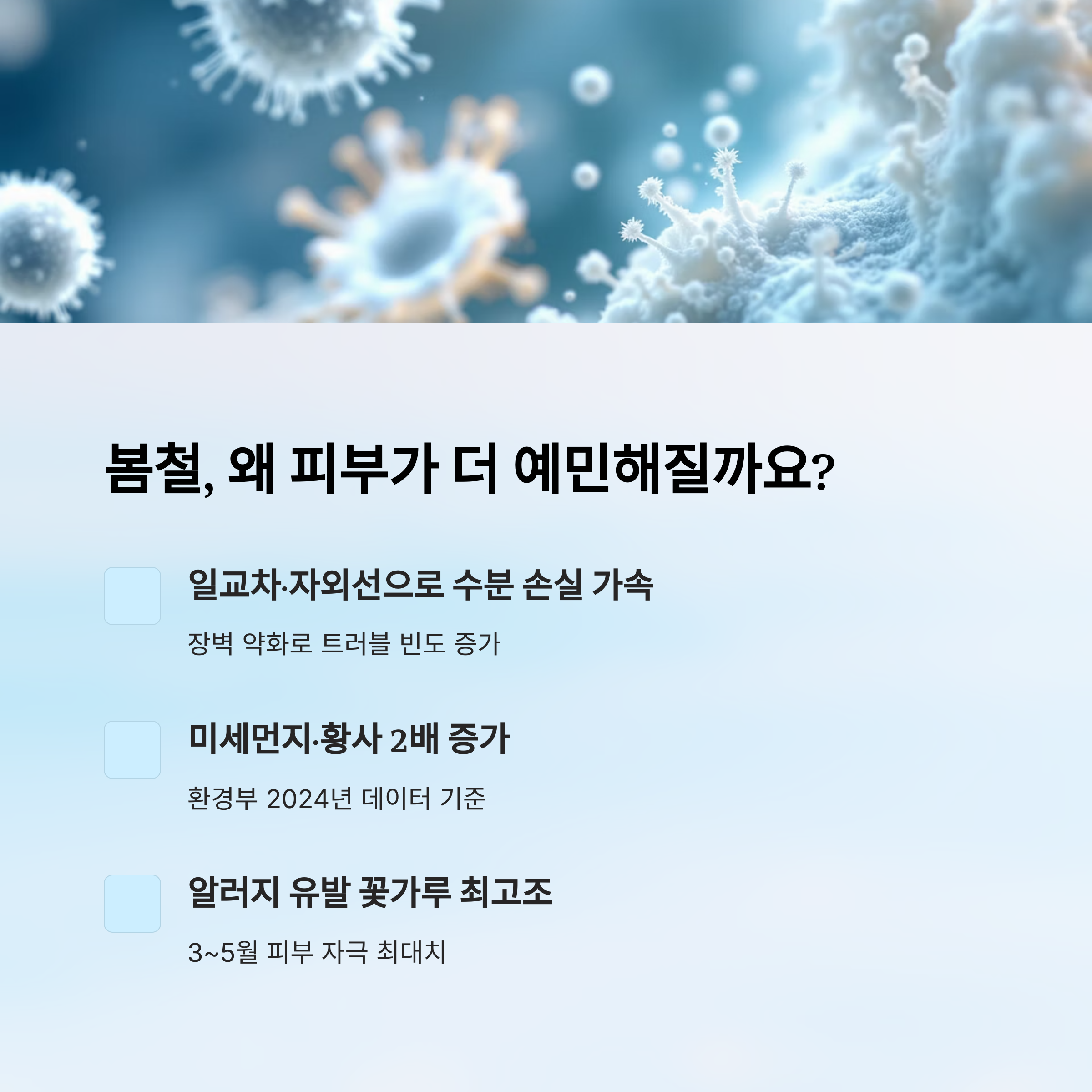 봄철은 일교차가 크고 꽃가루나 황사, 미세먼지 등 외부 환경 변화가 심해지기 때문에 민감성 피부를 가진 사람에게 특히 까다로운 계절이에요.