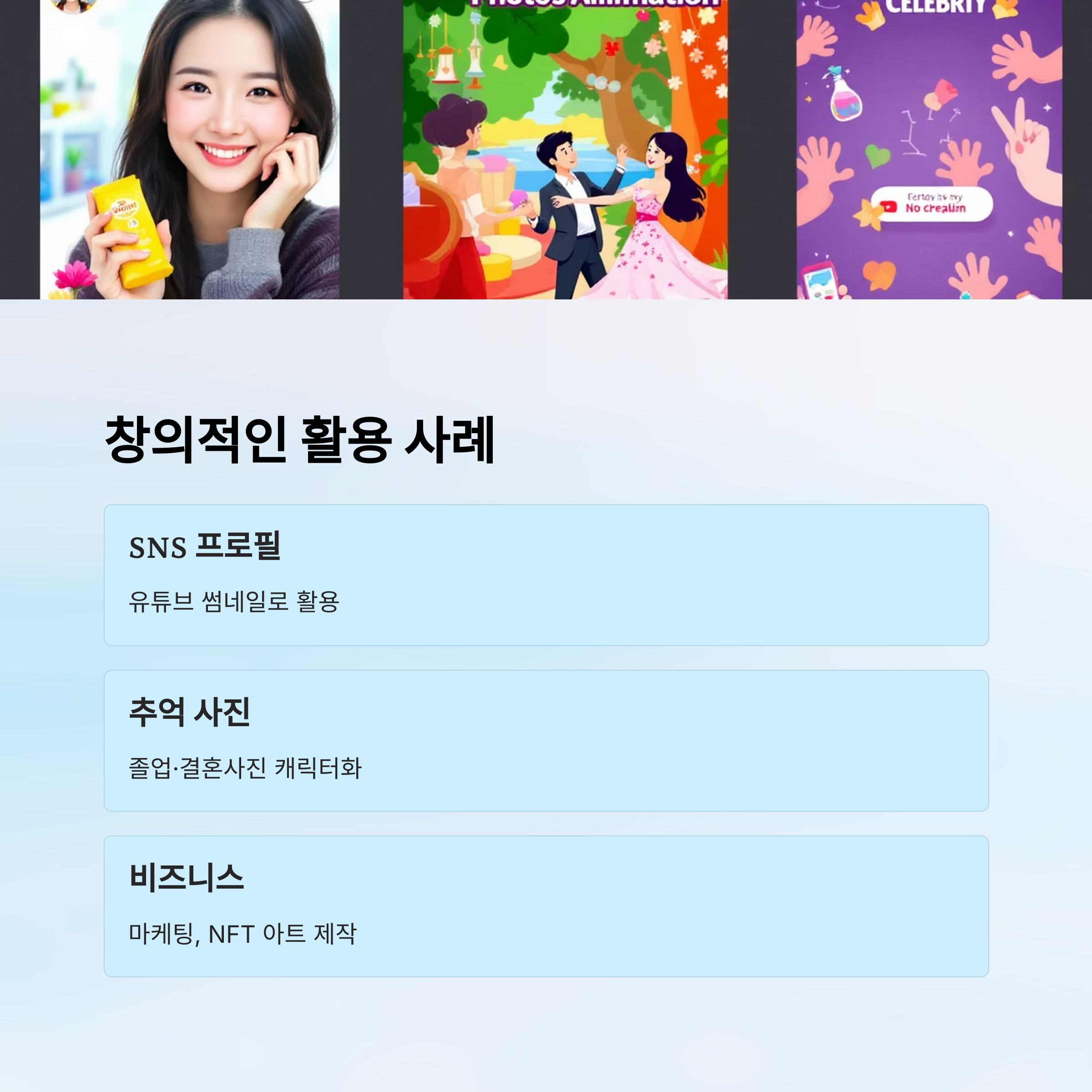 사진 애니메이션 AI 앱들은 단순 재미를 넘어 실생활 곳곳에서 다양한 방식으로 활용되고 있어요. 예를 들어, 결혼식 전 사진을 애니메이션 영상으로 만들어 추억을 더욱 특별하게 연출하거나, 반려동물 사진을 만화 스타일로 변환해 SNS에서 자랑하는 콘텐츠로 쓰는 사례도 많답니다.