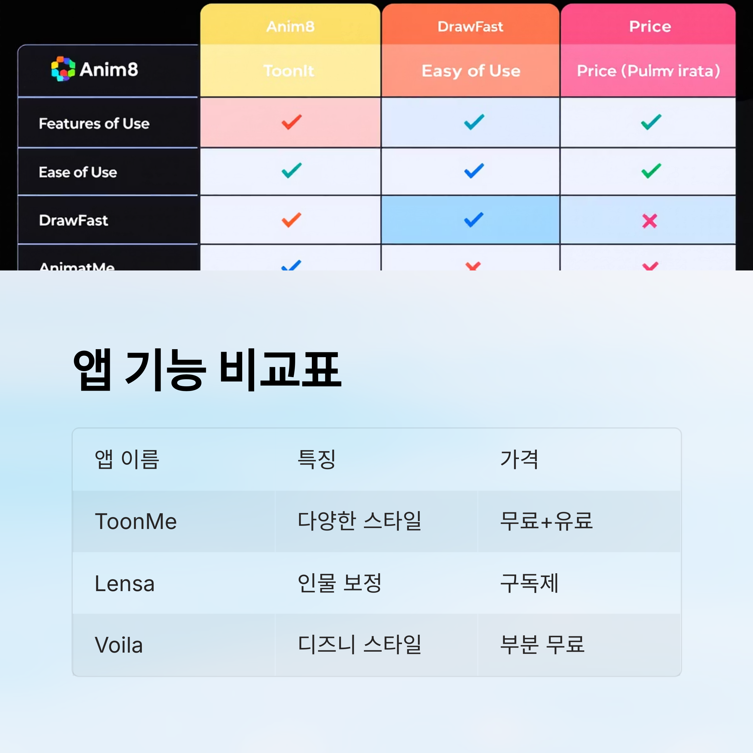 | 앱 | 애니메이션 스타일 | 실시간 지원 | 무료 여부 |