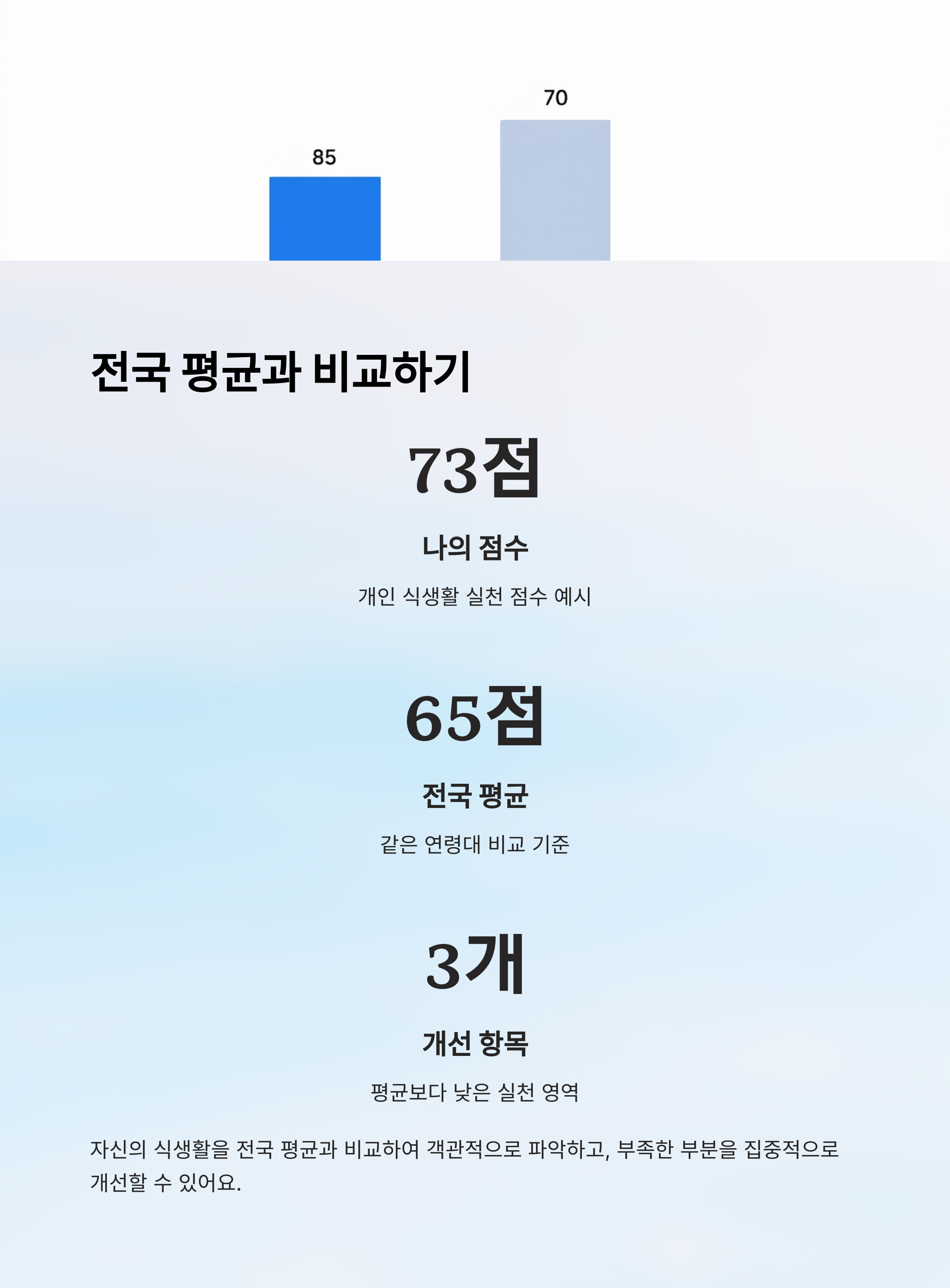 식생활 실천 점검표의 또 다른 장점은 내 점수를 전국 평균과 직접 비교할 수 있다는 점이에요. 단순히 내 점수만 확인하는 게 아니라, 나와 비슷한 연령대의 다른 사람들과 비교해 식생활 실천 수준이 어느 정도인지 파악할 수 있어요.