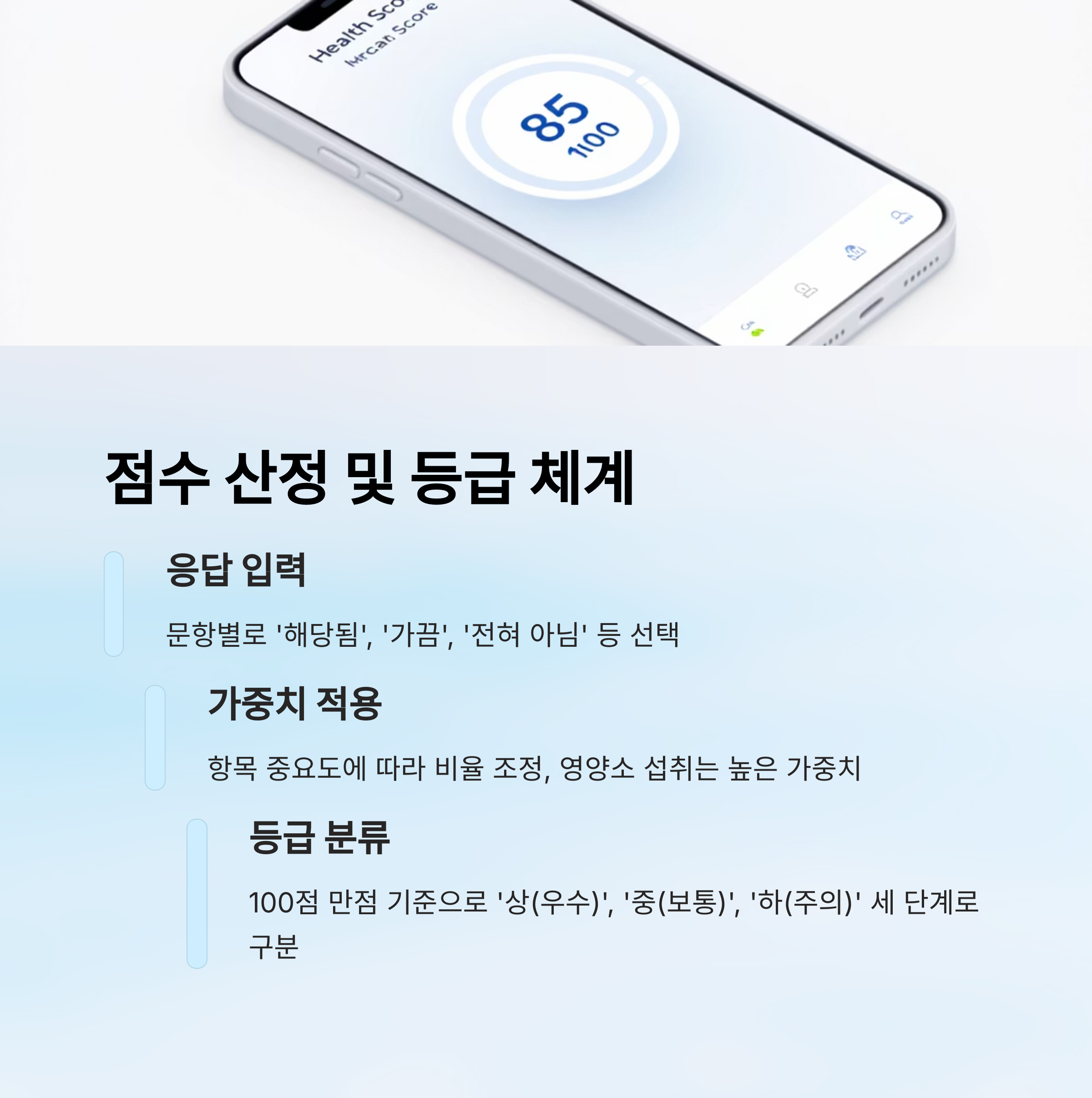 이처럼 생애주기별로 달라지는 점검 항목 덕분에, 점검 결과의 정확도도 훨씬 높아지고 실질적인 조언도 기대할 수 있어요. 다음으로는 어떻게 점수를 계산하고 등급을 나누는지 알아볼게요! 🧾