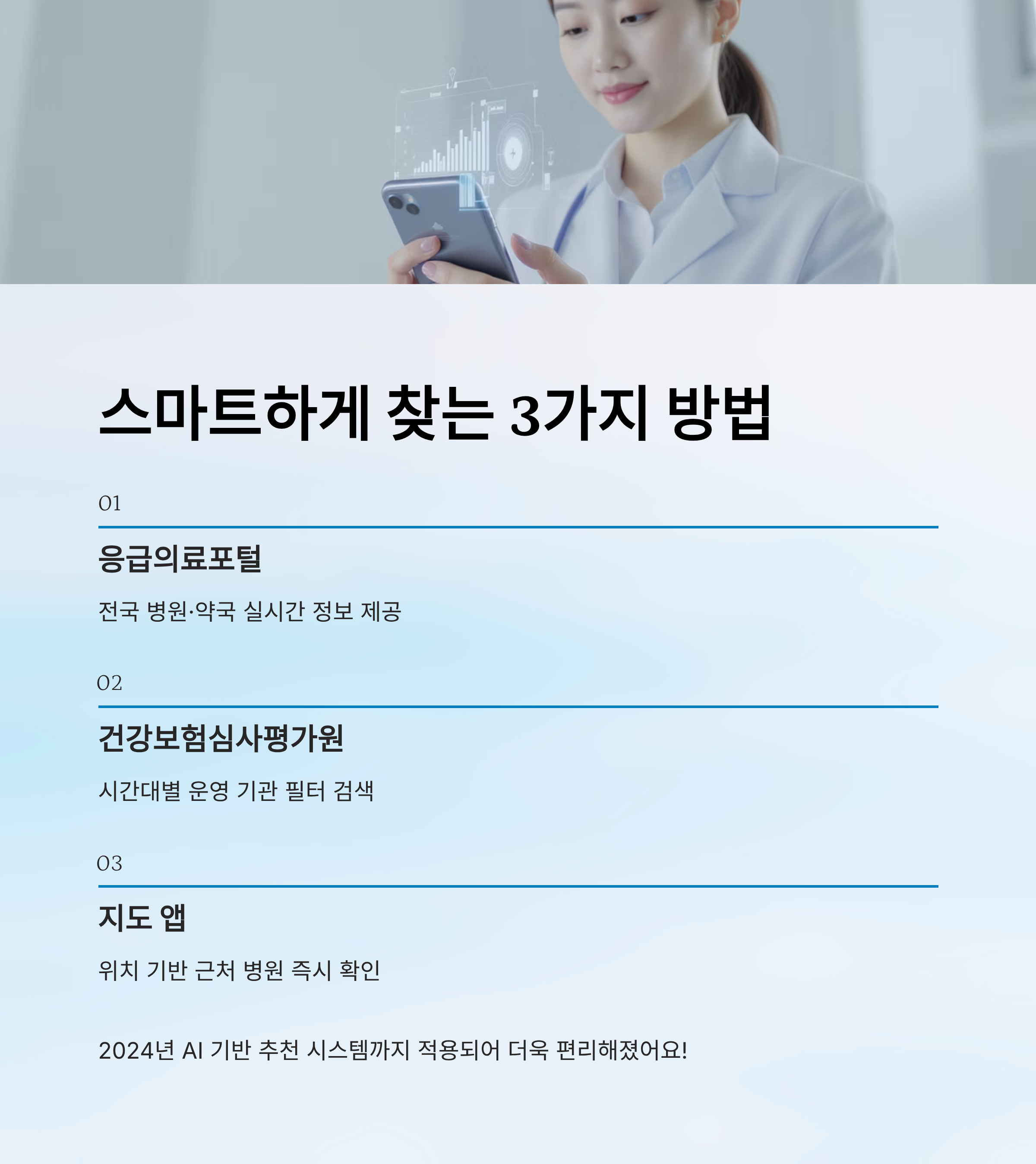 요즘은 굳이 전단지나 전화로 문의하지 않아도 스마트폰 하나만 있으면 병원, 약국 운영 정보를 바로 확인할 수 있어요. 특히 2024년엔 AI 기반 데이터 추천 시스템까지 적용되어 훨씬 편리해졌답니다!