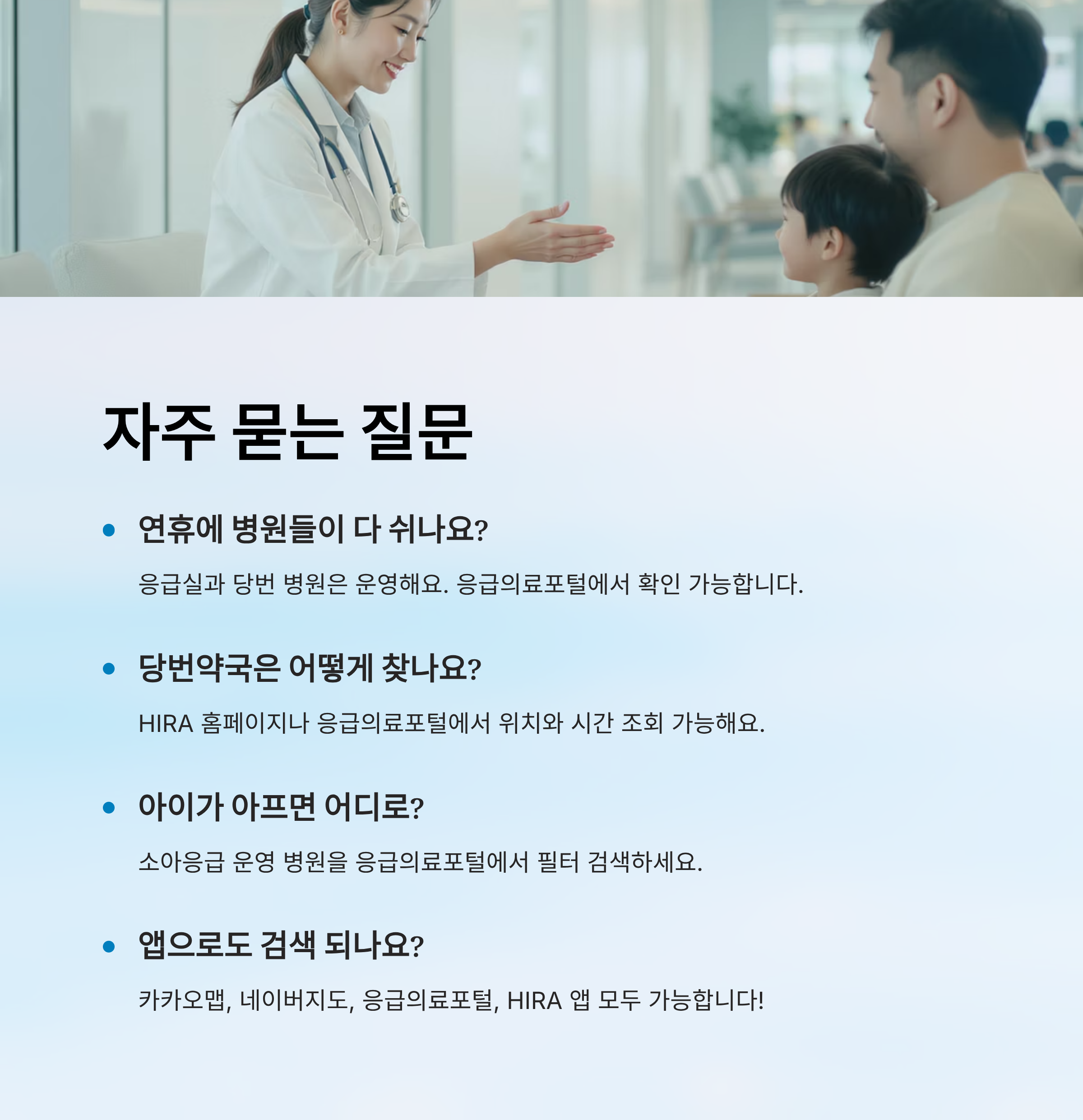 A4. 소아응급을 운영하는 병원은 응급의료포털에서 필터로 검색할 수 있어요. 지역 소아과 당번병원도 함께 확인해보세요.