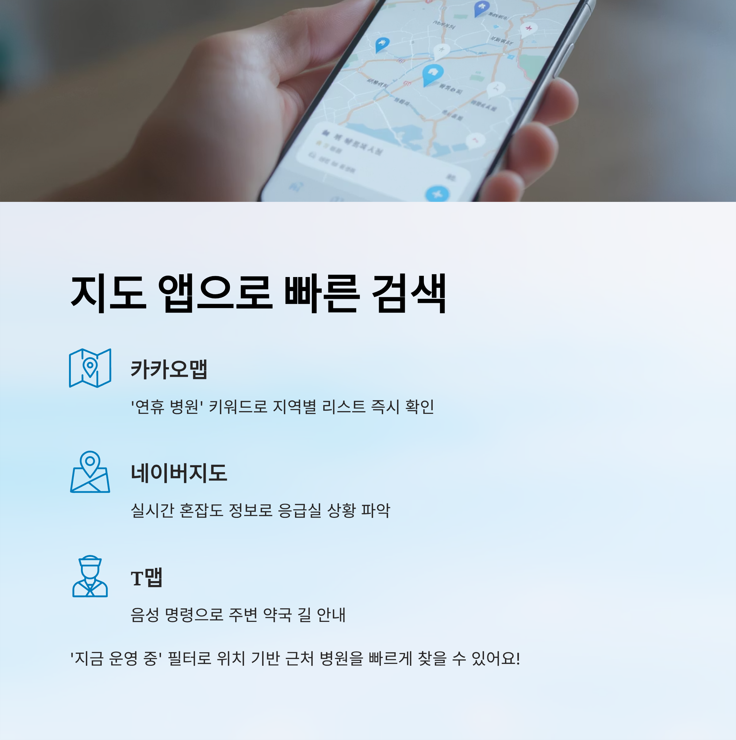 지도 앱은 위치 기반으로 근처에 운영 중인 병원이나 약국을 빠르게 찾는 데 최고예요. 카카오맵, 네이버지도, T맵 모두 병원·약국 아이콘을 터치하면 운영 여부, 평점, 거리 등을 실시간으로 보여줘요. 특히 ‘지금 운영 중’ 필터는 연휴에 아주 유용하답니다.