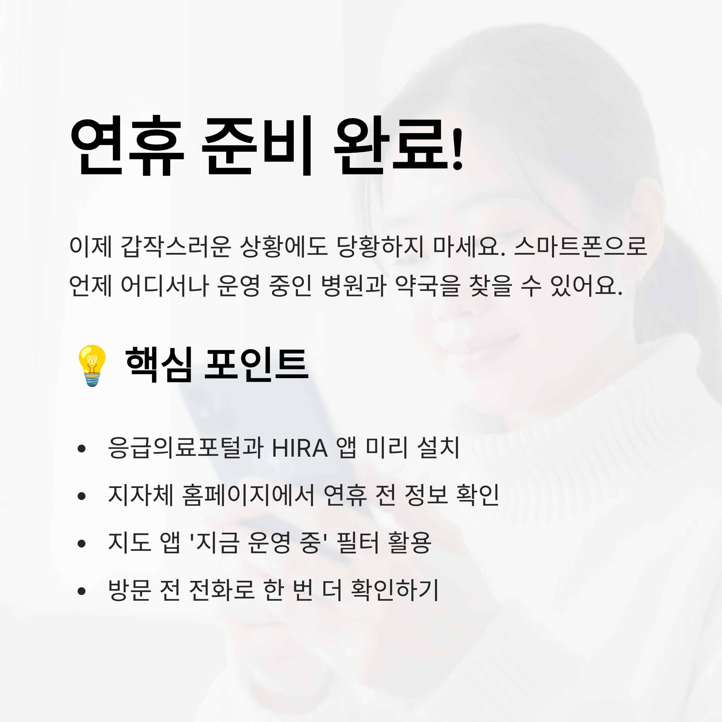 보건소나 각 지역 병원 게시판에도 이 정보를 미리 붙여두는 경우가 많고, 대형마트 내 약국은 일부 연휴 기간에도 운영되기도 해요. 하지만 운영 여부는 지역에 따라 다르니 사전 확인은 필수랍니다!