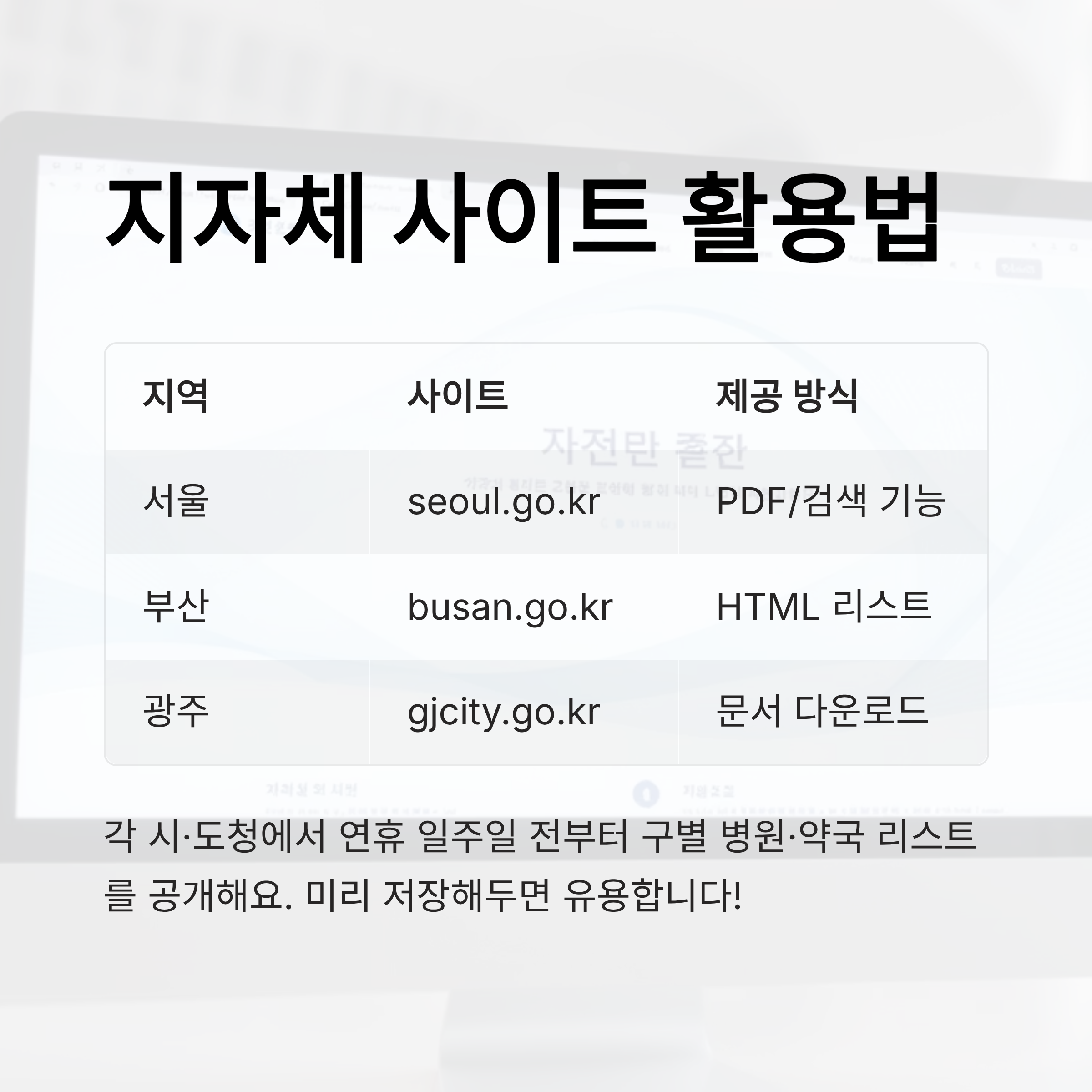 예를 들어, ‘서울특별시청’ 홈페이지에서는 설날·추석 등 주요 연휴마다 ‘설 연휴 문 여는 병원·약국 안내’ 배너를 메인에 노출하고 있어요. 클릭하면 구별 리스트가 PDF나 엑셀 형식으로 제공되기 때문에 미리 저장해두면 유용해요.