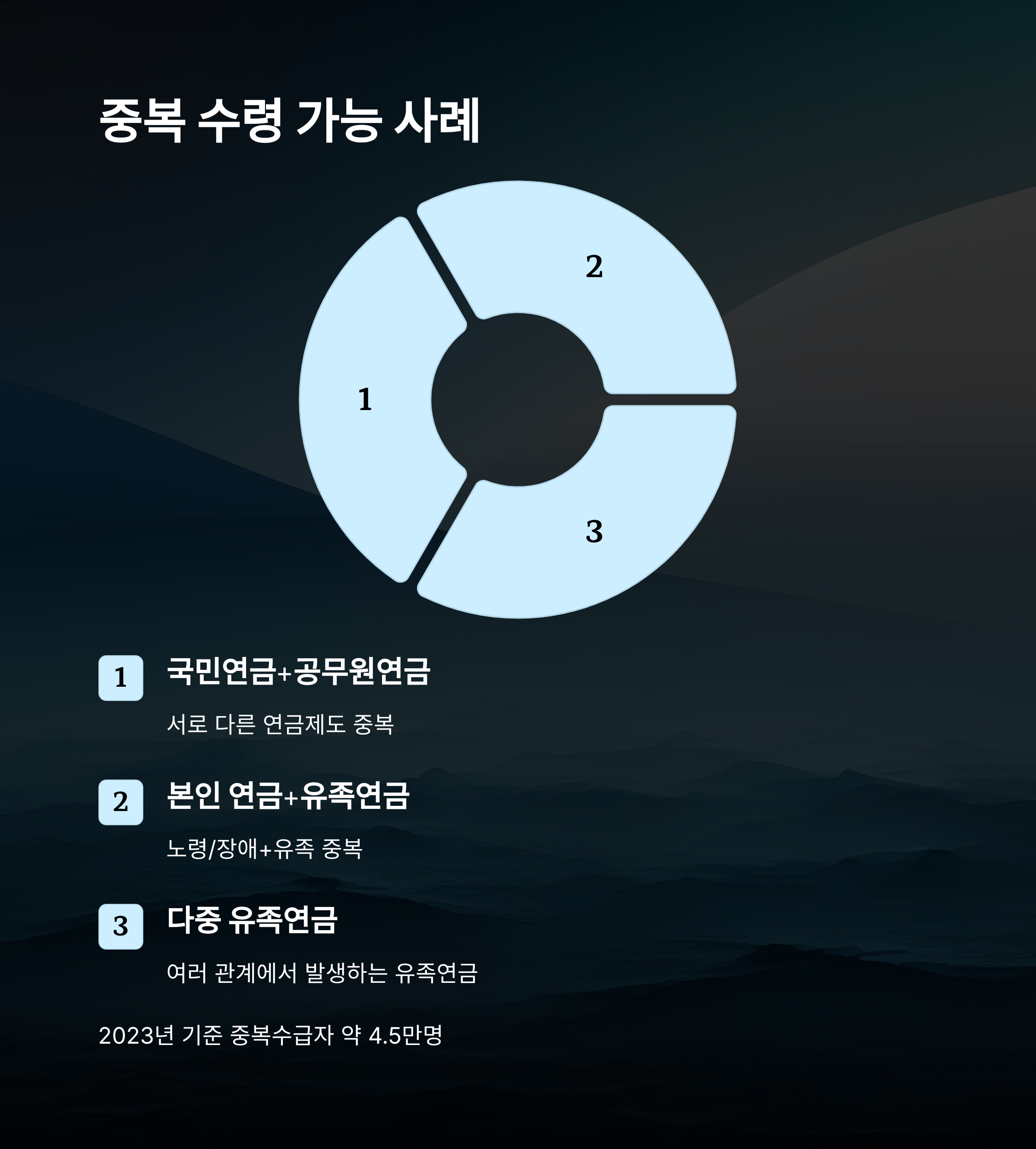 의외로 많은 분들이 이 '중복 수령' 문제를 잘 모르고 계시는데요. 실제로는 유족연금과 국민연금, 공무원연금 등이 겹치는 경우 연금액이 조정될 수 있어요.