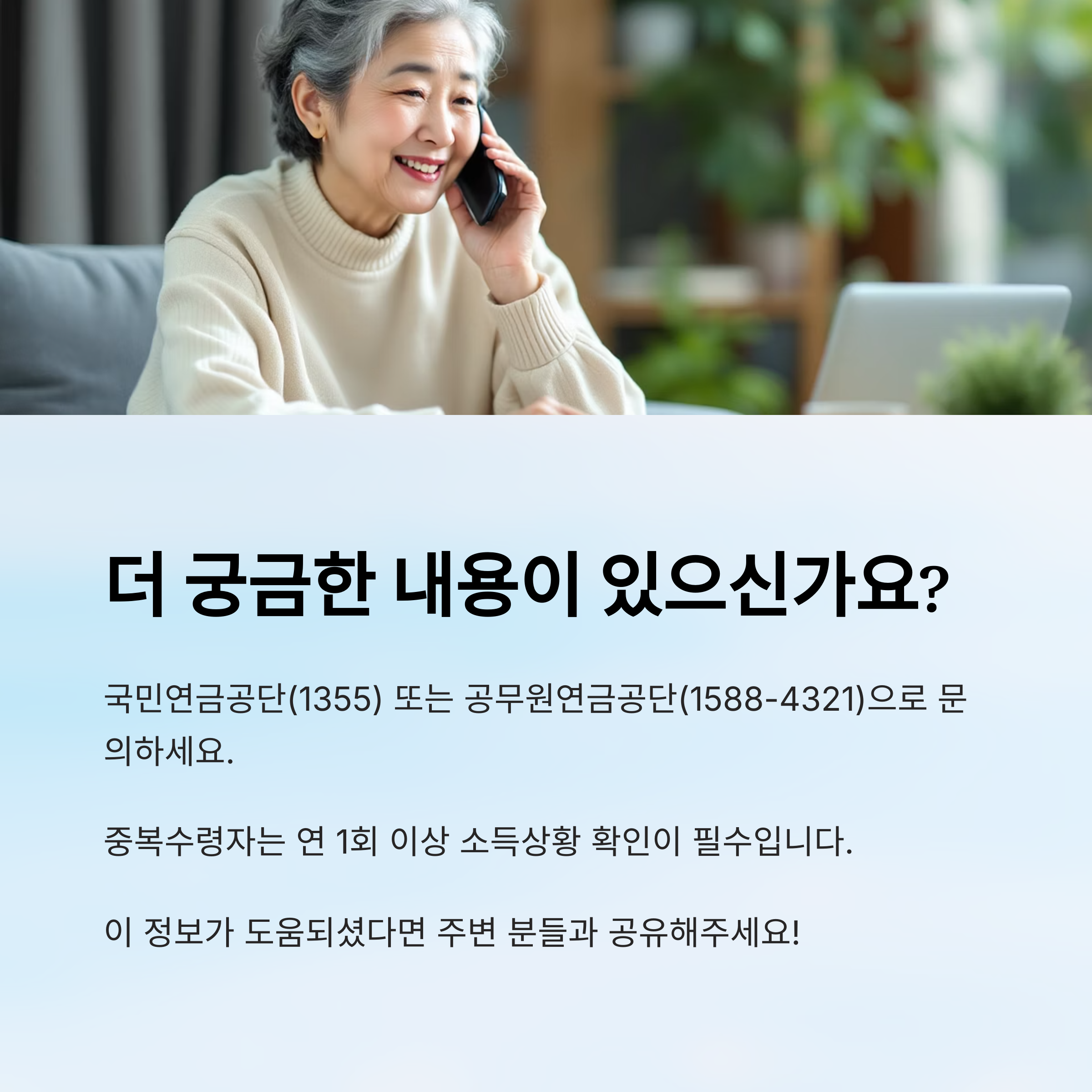 따라서 연금을 2개 이상 수령 중이라면 ‘국민연금공단’ 또는 ‘공무원연금공단’ 등에 문의해 정확한 수령 가능액과 조정 여부를 확인하는 것이 필요해요.📞