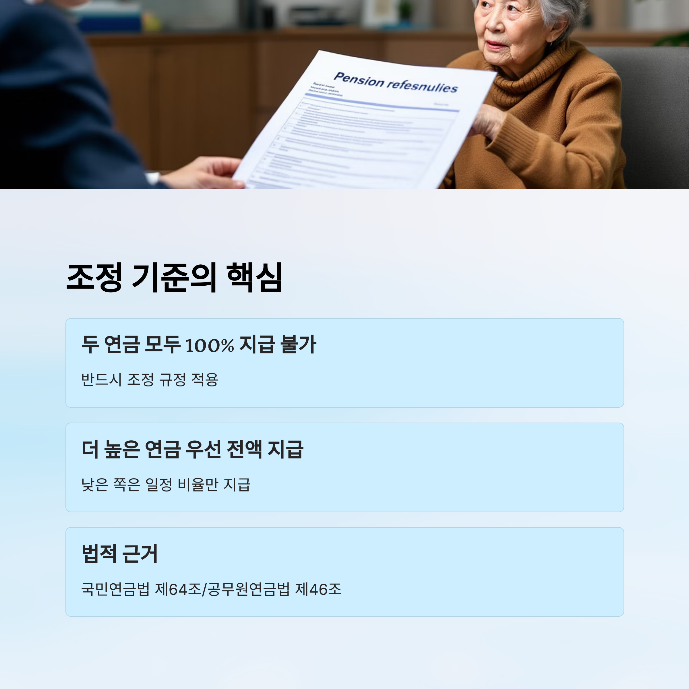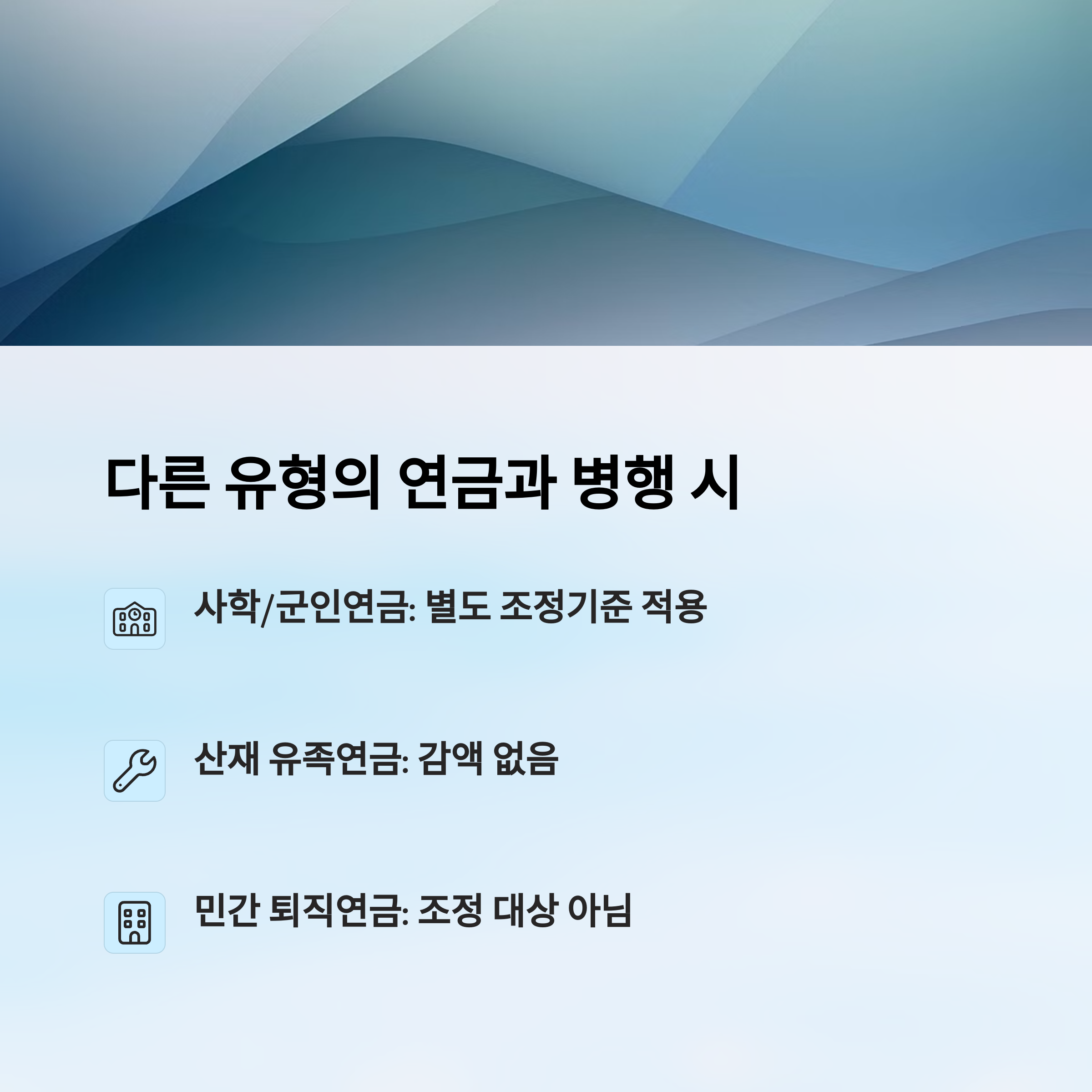 유족연금 외에도 본인이 노령연금, 장애연금, 기초연금 등 다른 연금을 받고 있는 경우에는 각각의 조정 기준이 별도로 있어요. 무조건 ‘합산’되지 않기 때문에 유의해야 해요.