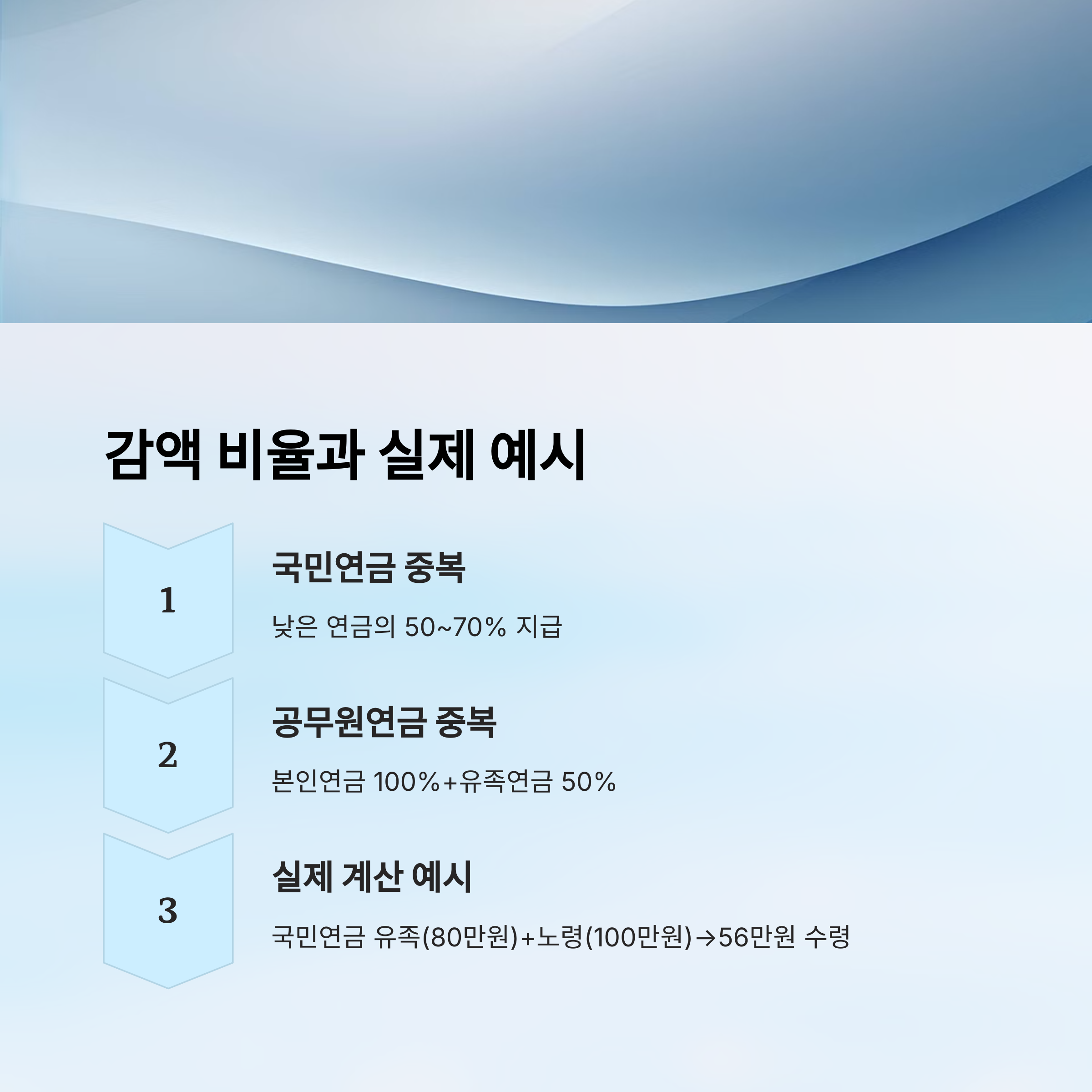 즉, 두 연금 중 하나는 100% 받고, 나머지 연금은 '일정 비율'만큼 받는 방식이죠. 이 비율은 상황에 따라 다르지만, 일반적으로 30~50% 범위예요.