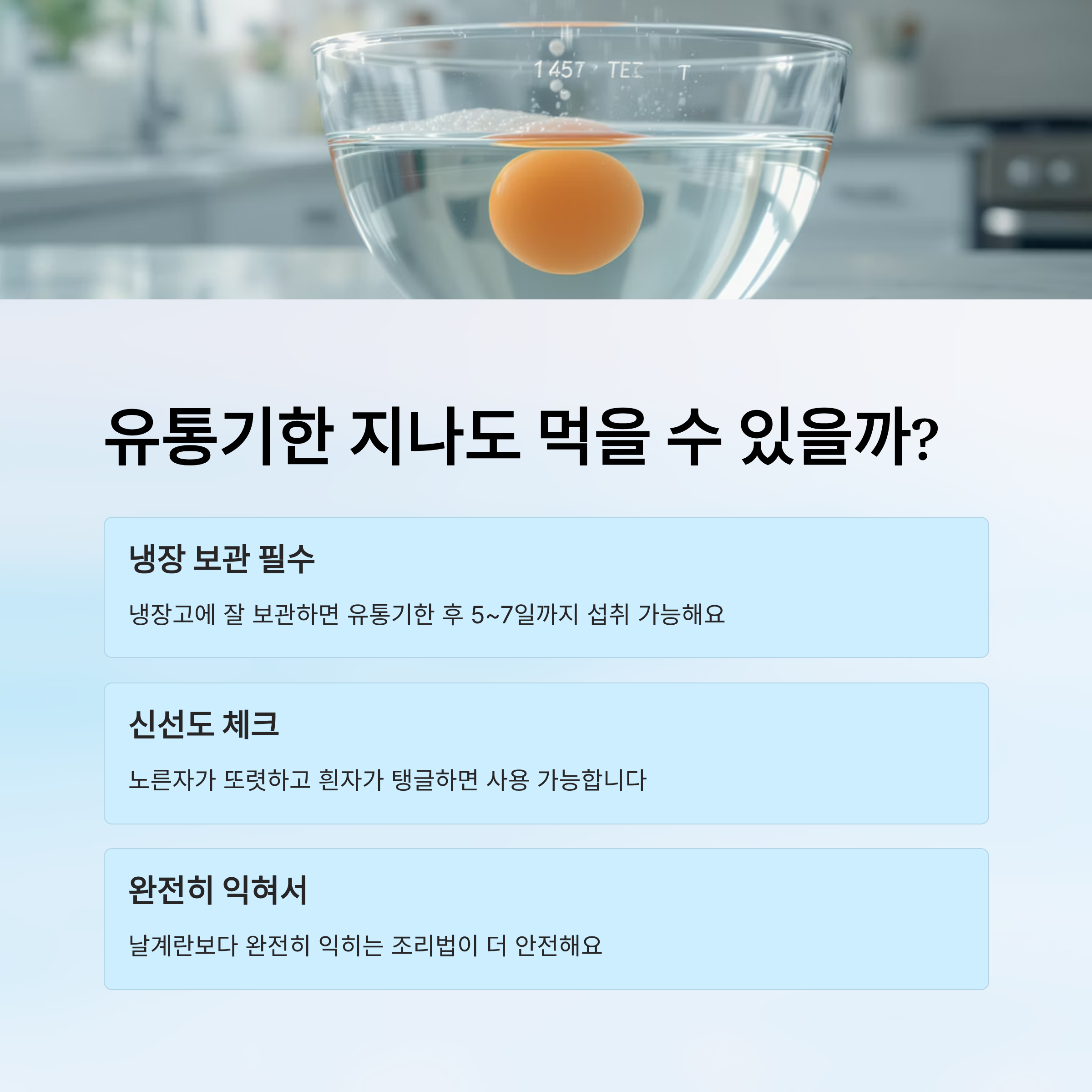 많은 사람이 유통기한이 지나면 바로 버려야 한다고 생각하지만, 이는 ‘판매 기한’일 뿐이에요. 식품안전처에서도 계란은 유통기한이 지난 후 냉장 보관 상태에 따라 5~7일까지는 섭취 가능하다고 안내하고 있어요. 단, 신선도 검사는 필수예요!