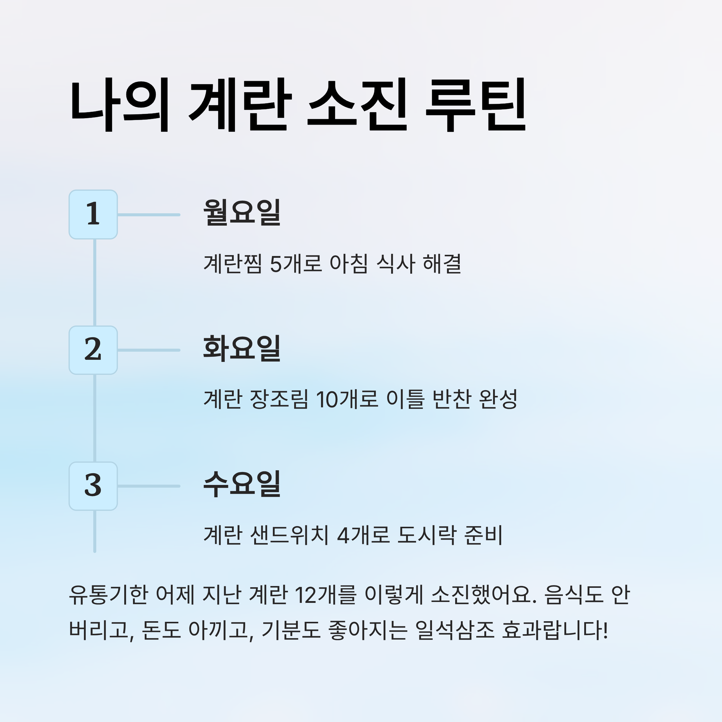 지금이 바로 실천할 때예요. 내 냉장고 안의 계란이 더 이상 유통기한이 지난 쓰레기가 아니라, 한 끼의 즐거운 식사가 되게 해주세요!