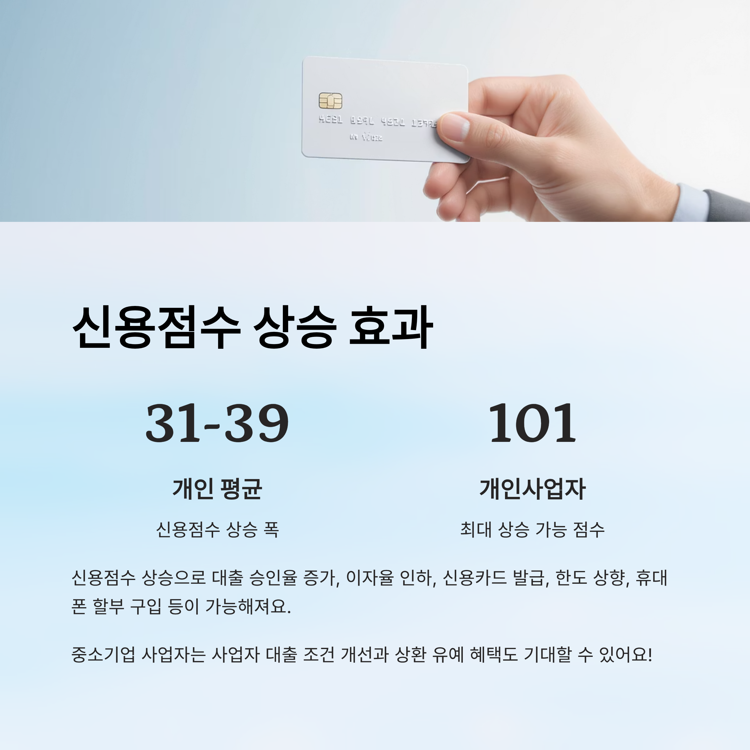 연체 기록이 삭제되면 가장 직접적으로 체감되는 변화는 바로 ‘신용점수’ 상승이에요. 개인의 경우 평균적으로 31점에서 39점 정도, 개인사업자는 무려 101점 가까이 상승할 수 있어요. 😲