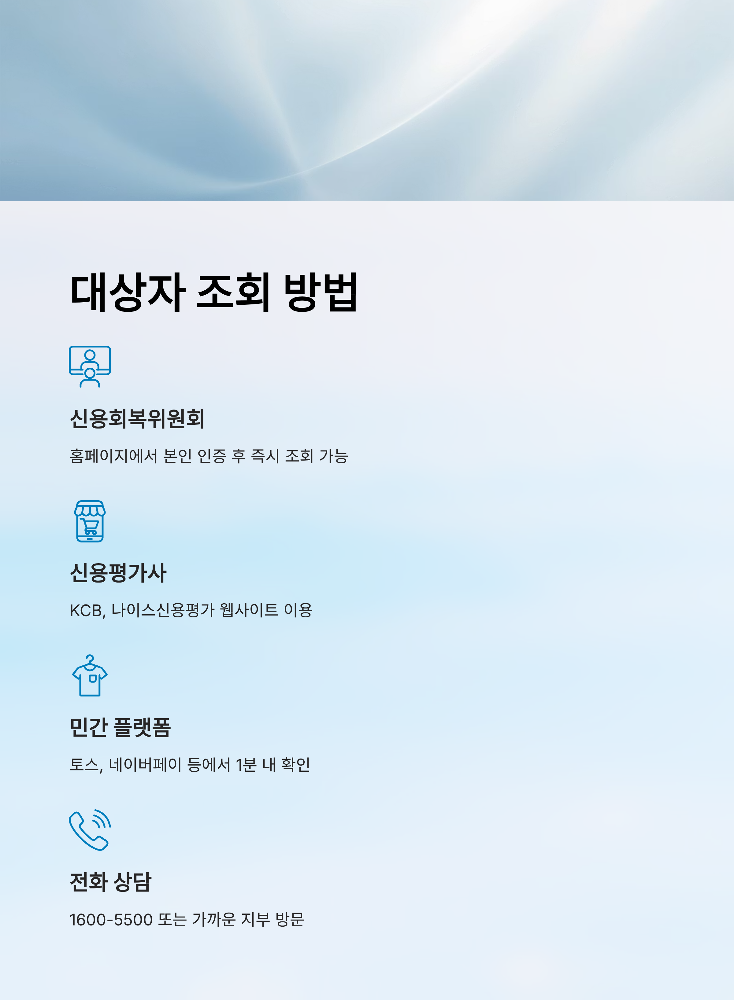 2025년 신용회복지원은 별도의 신청이 없어도 자동 적용되지만, 자신이 대상자인지 확인하는 것이 가장 먼저 해야 할 일이에요. 다행히 조회는 정말 쉬워요. 😊