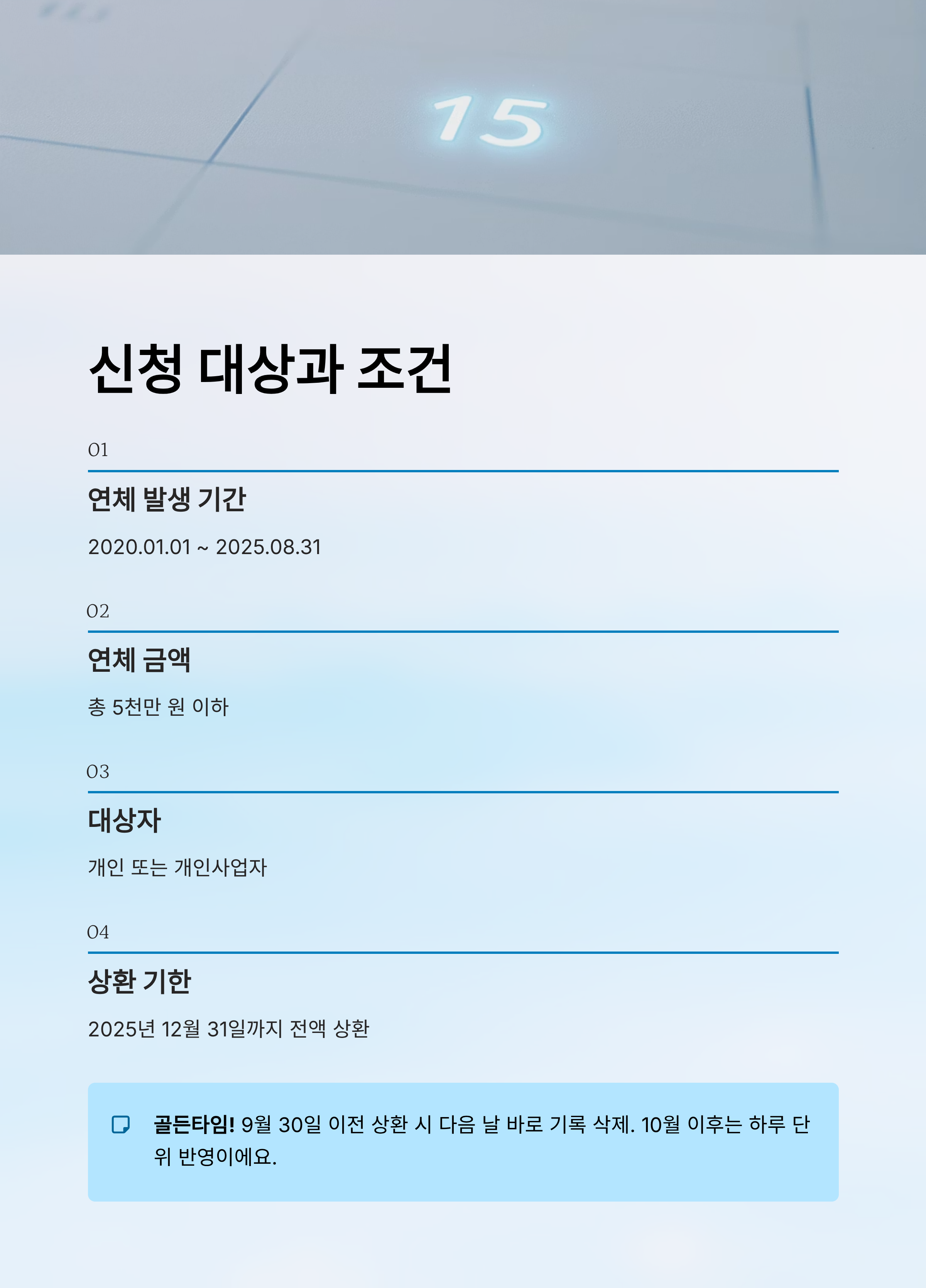 삭제는 연체금 5천만 원 이하이며, 2020년 1월 1일~2025년 8월 31일 사이 발생한 건에 한해서만 해당돼요. 이후 발생한 연체는 적용되지 않기 때문에, 지금이 마지막 기회일 수 있어요.