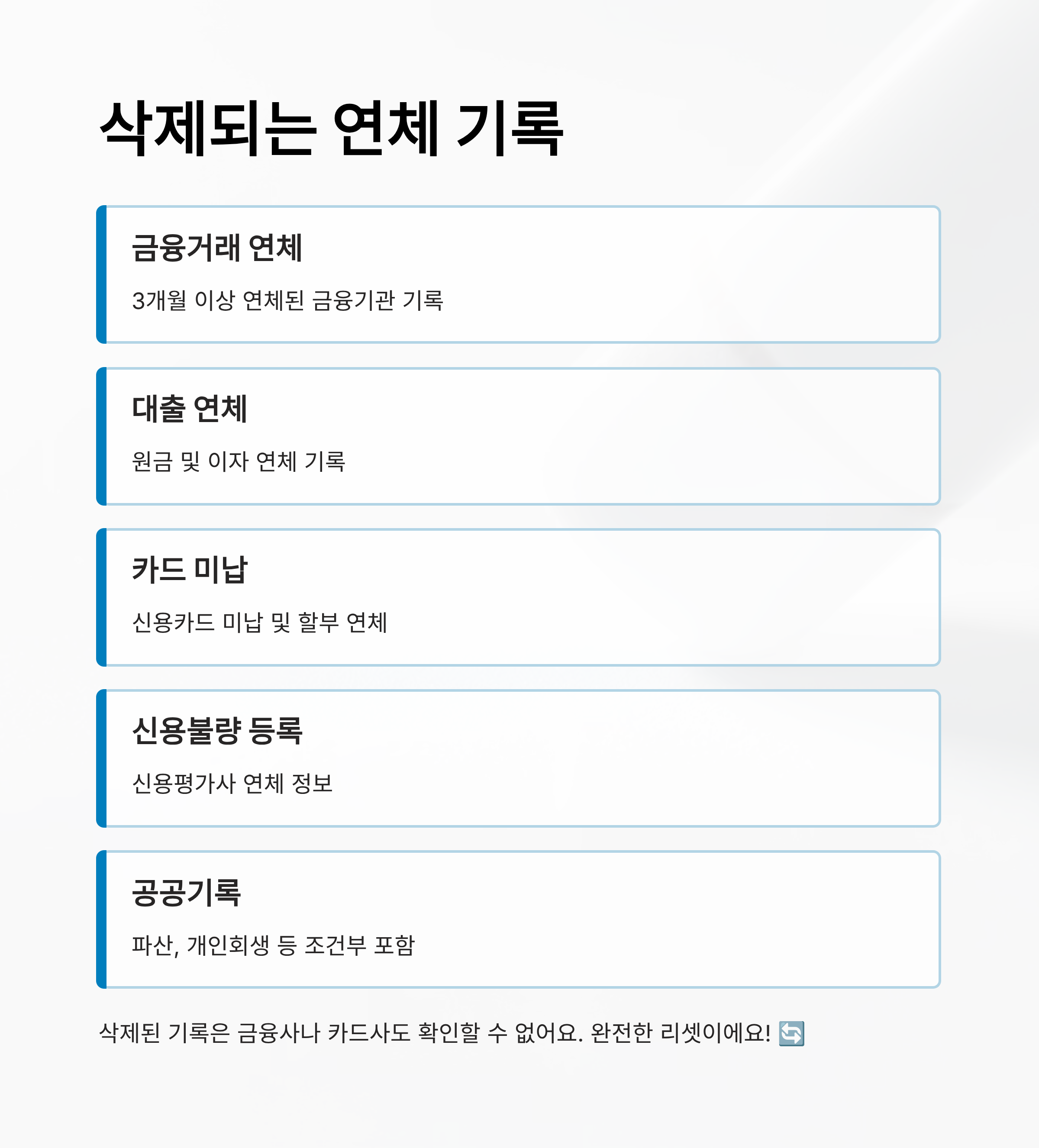 삭제 대상은 다음과 같아요: 금융기관에 3개월 이상 연체된 금융거래 기록, 대출 원금 및 이자 연체 기록, 신용카드 미납/할부 연체, 신용불량 등록 기록, 신용평가사(KCB/NICE) 연체 정보, 심지어는 공공기록(파산, 개인회생 등)도 경우에 따라 포함돼요.
