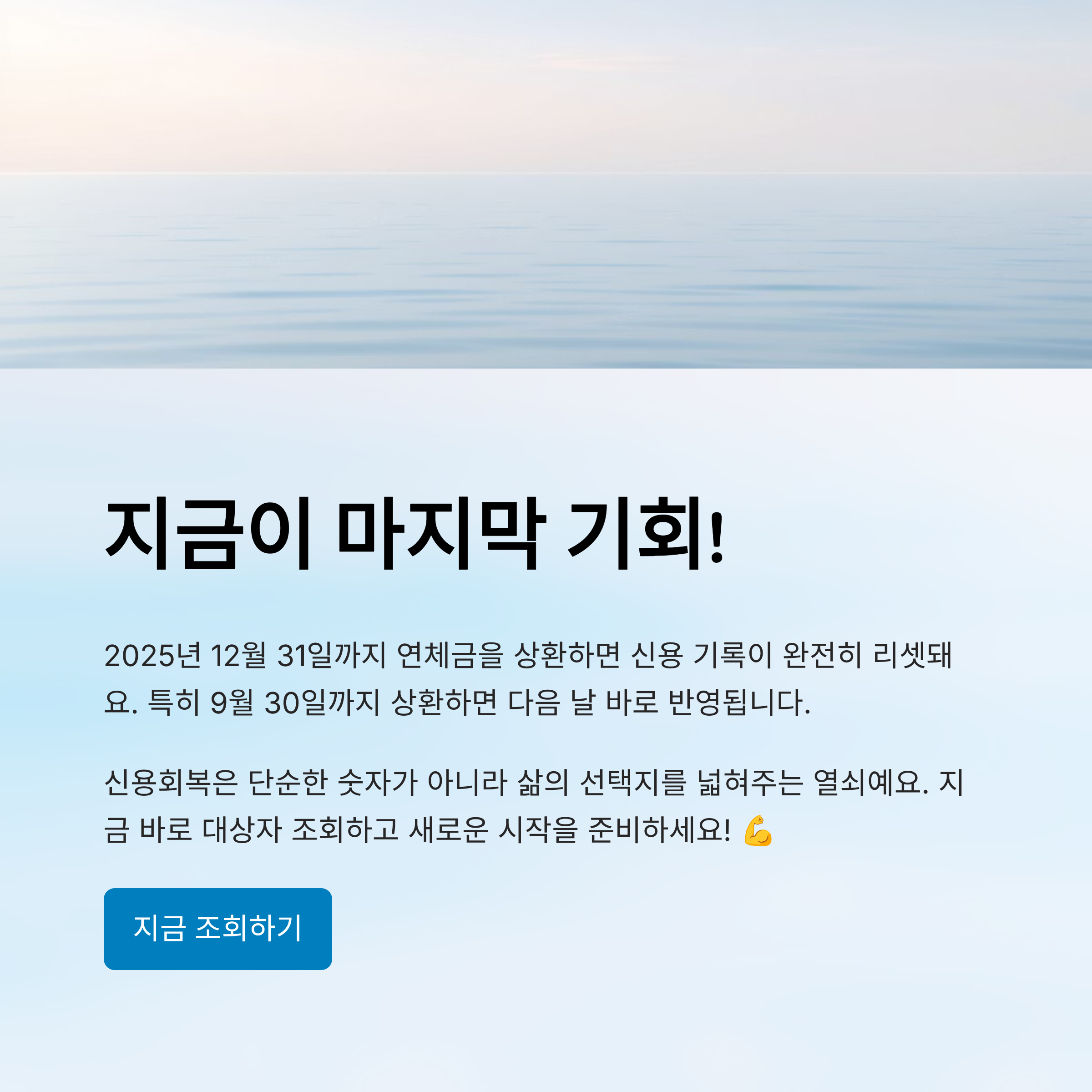 특히 2020년부터 2025년 8월 사이에 5천만 원 이하 연체가 발생한 경우, 올 연말까지 전액 상환하면 연체기록이 삭제되고 신용점수가 즉시 상승해요. 그야말로 신용 ‘사면’이라 불릴 정도로 파격적인 혜택이 쏟아지고 있는 셈이죠. 😊
