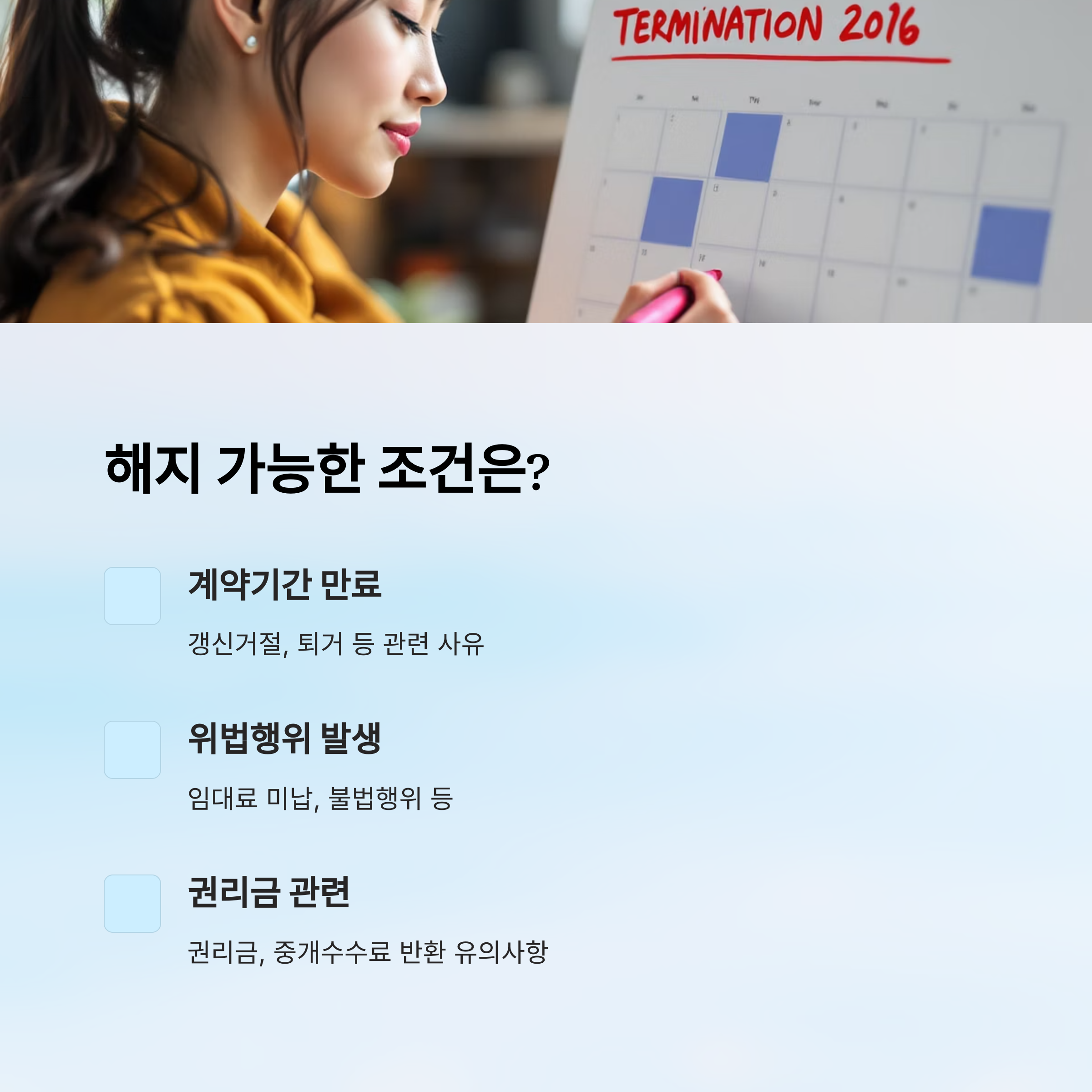 가장 대표적인 해지 조건은 계약서에서 정한 해지 조항이에요. 계약서에 ‘임차인은 3개월 전 사전 통보 후 계약을 해지할 수 있다’는 내용이 있다면 해당 조항을 따르면 돼요. 하지만 계약서에 별도 규정이 없다면 법적으로 인정되는 사유가 있어야 해요.
