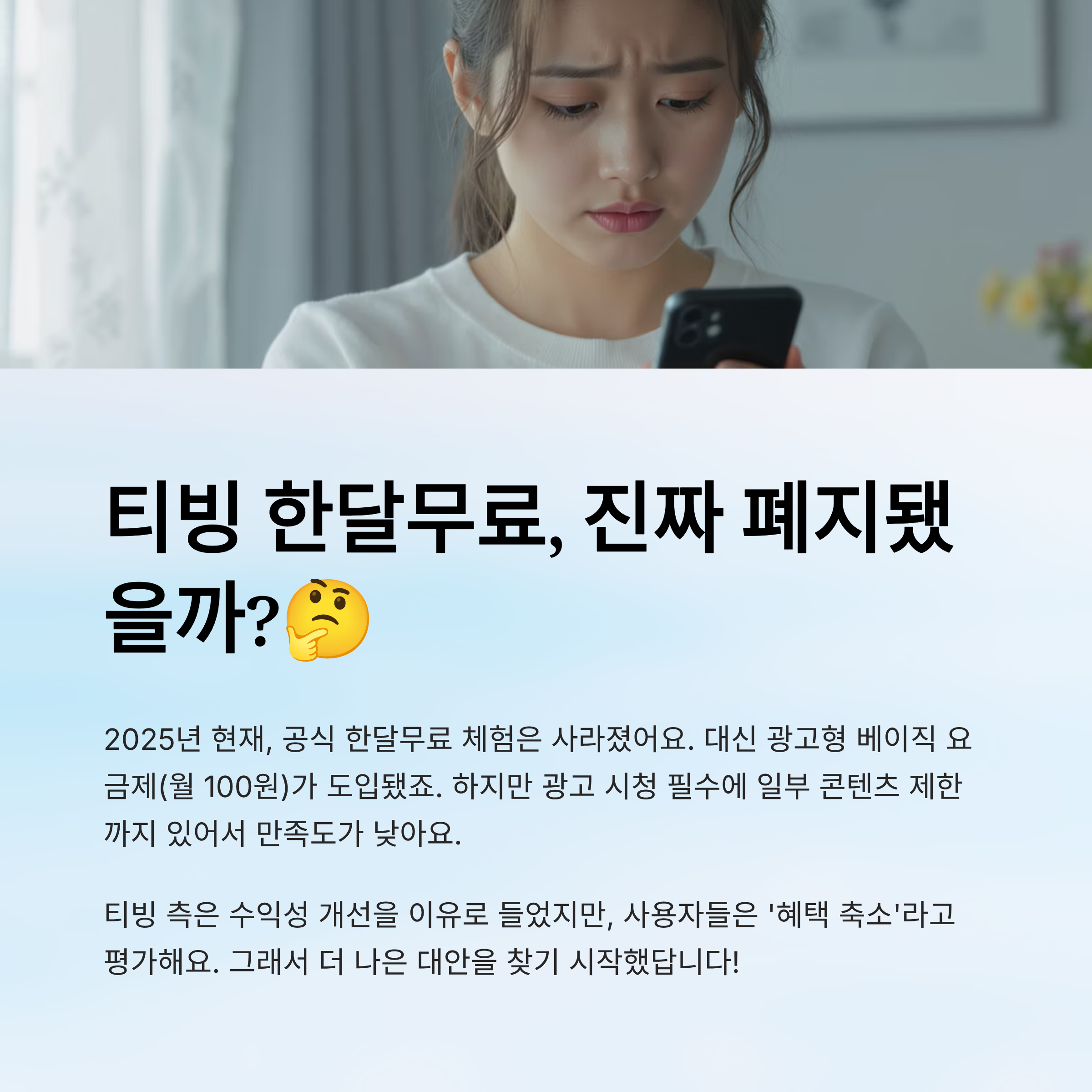티빙을 싸게 보는 시대가 끝났다고 느꼈다면, 아직 이 글을 안 본 거예요! 🧠 최근 티빙 한달무료 혜택이 조용히 사라지면서 많은 분들이 혼란스러워했죠. 광고형 100원 요금제가 새로운 대안으로 떠오르긴 했지만, 광고를 강제로 봐야 하고 해지 시점도 복잡해서 만족스럽지 못하다는 반응이 많아요.