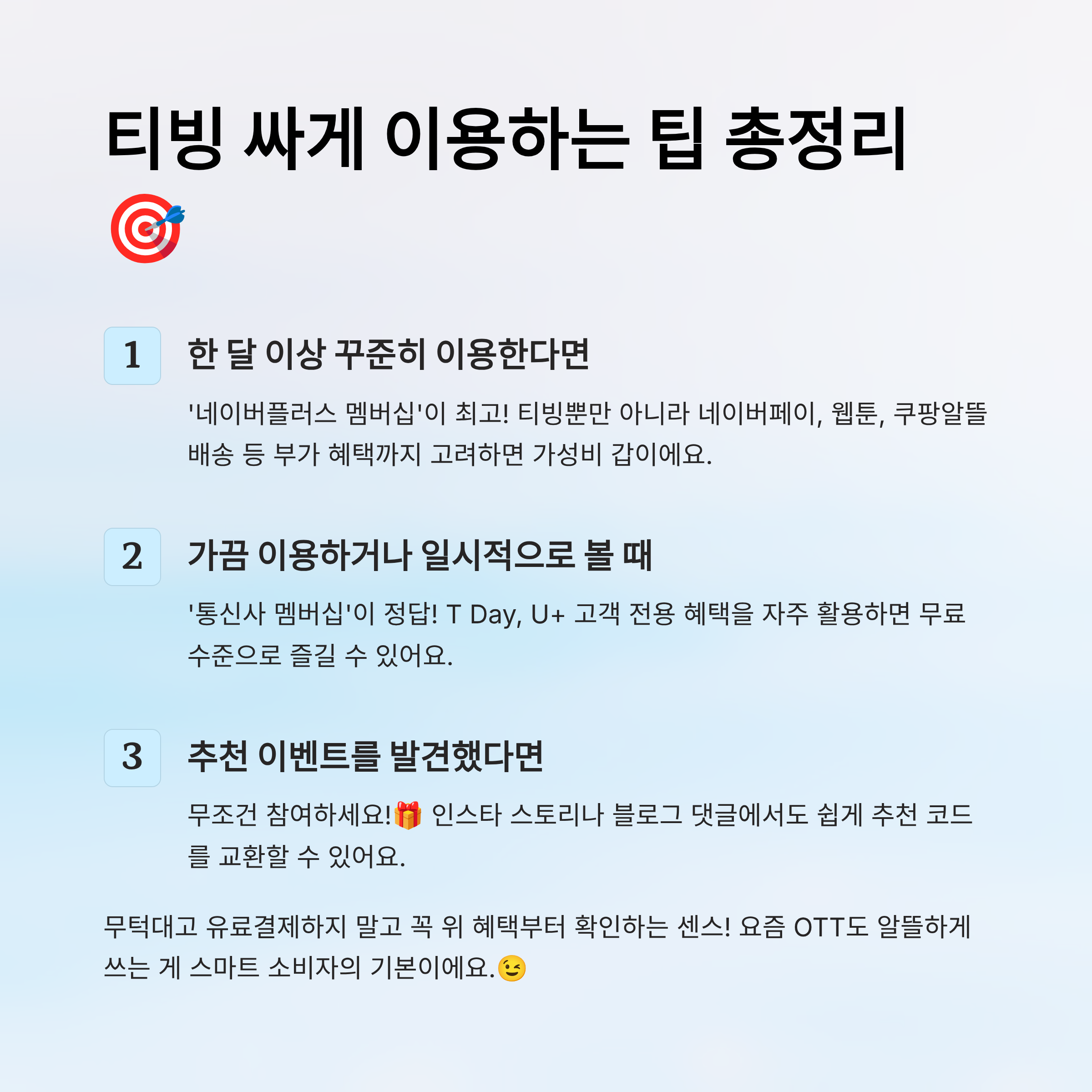 티빙 한달 무료가 사라졌다고 실망하긴 이르죠! 🎉 지금까지 소개한 3가지 방법은 각각 상황에 따라 최적의 선택이 될 수 있어요. 여기서 다시 한 번, 어떤 조합이 가장 좋은지 팁을 정리해볼게요!
