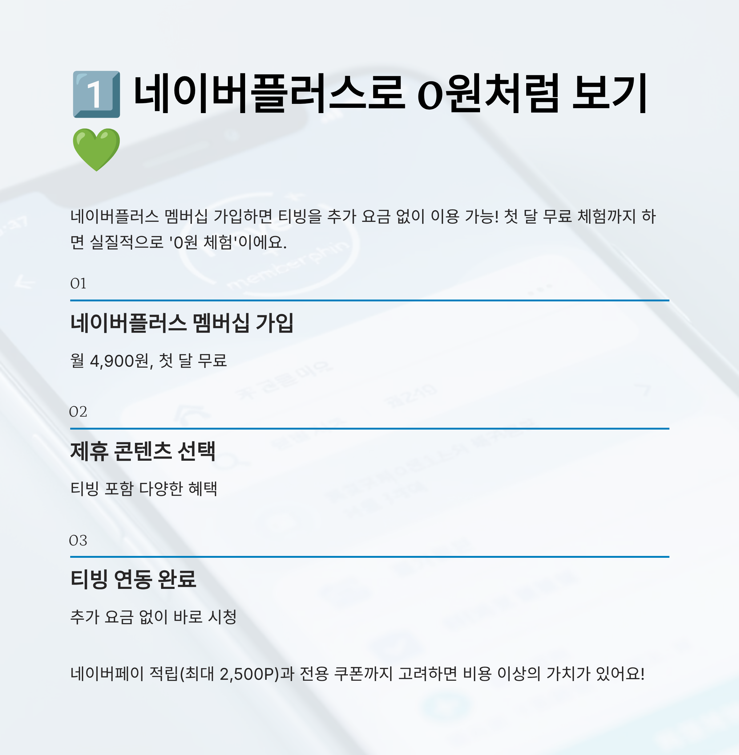 📌 티빙을 한 달 이상 꾸준히 이용할 예정이라면 ‘네이버플러스 멤버십’이 최고예요. 단순히 티빙뿐만 아니라 네이버페이, 웹툰, 쿠팡알뜰배송 등 부가 혜택까지 고려하면 가성비가 진짜 좋아요.