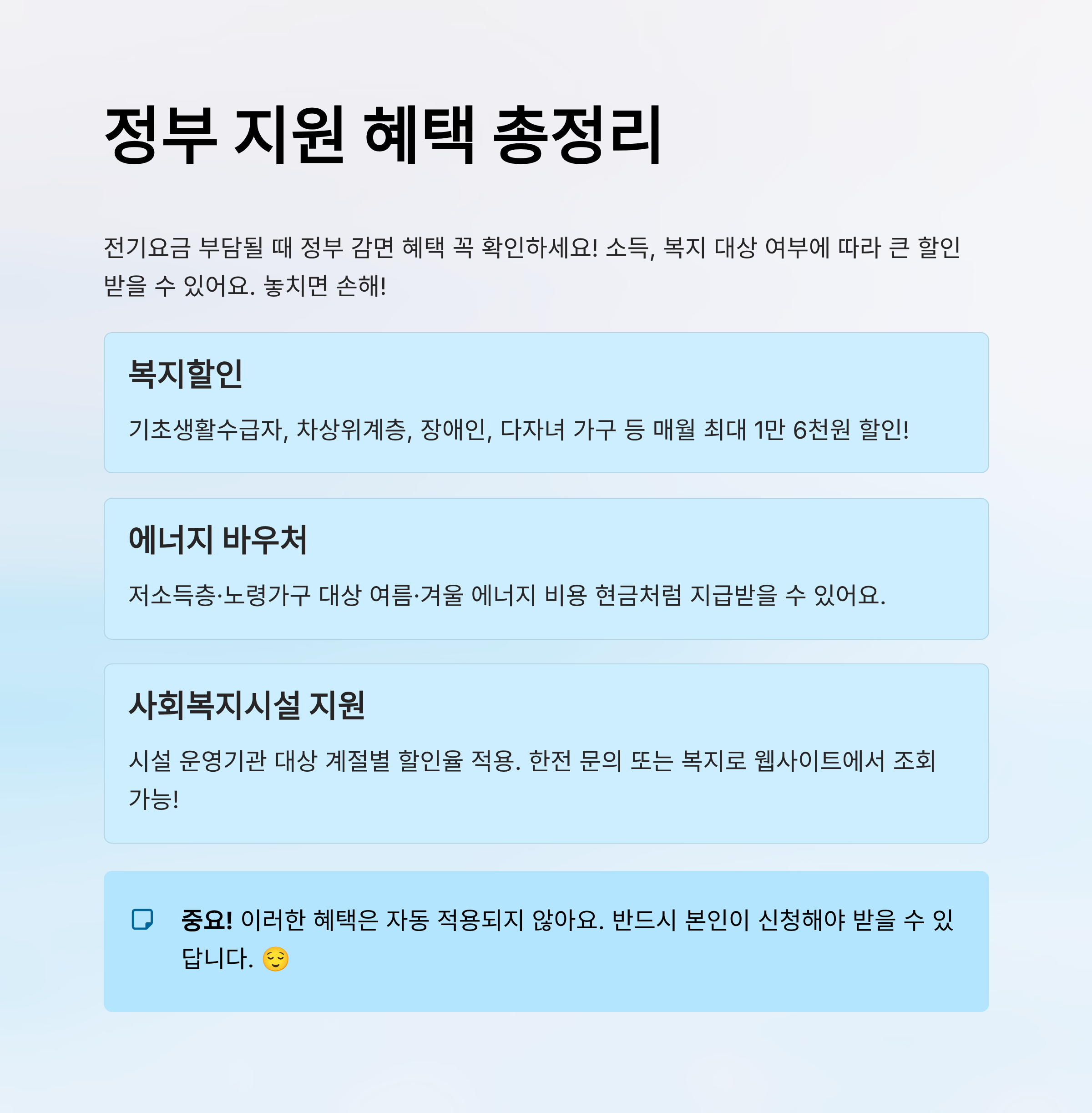 📌 본 글은 2025년 7월 기준 공공기관 발표 자료 및 통계를 기반으로 작성되었으며, 정책 및 요금은 변동될 수 있어요. 정확한 내용은 한국전력 및 복지로 사이트에서 반드시 확인해주세요.