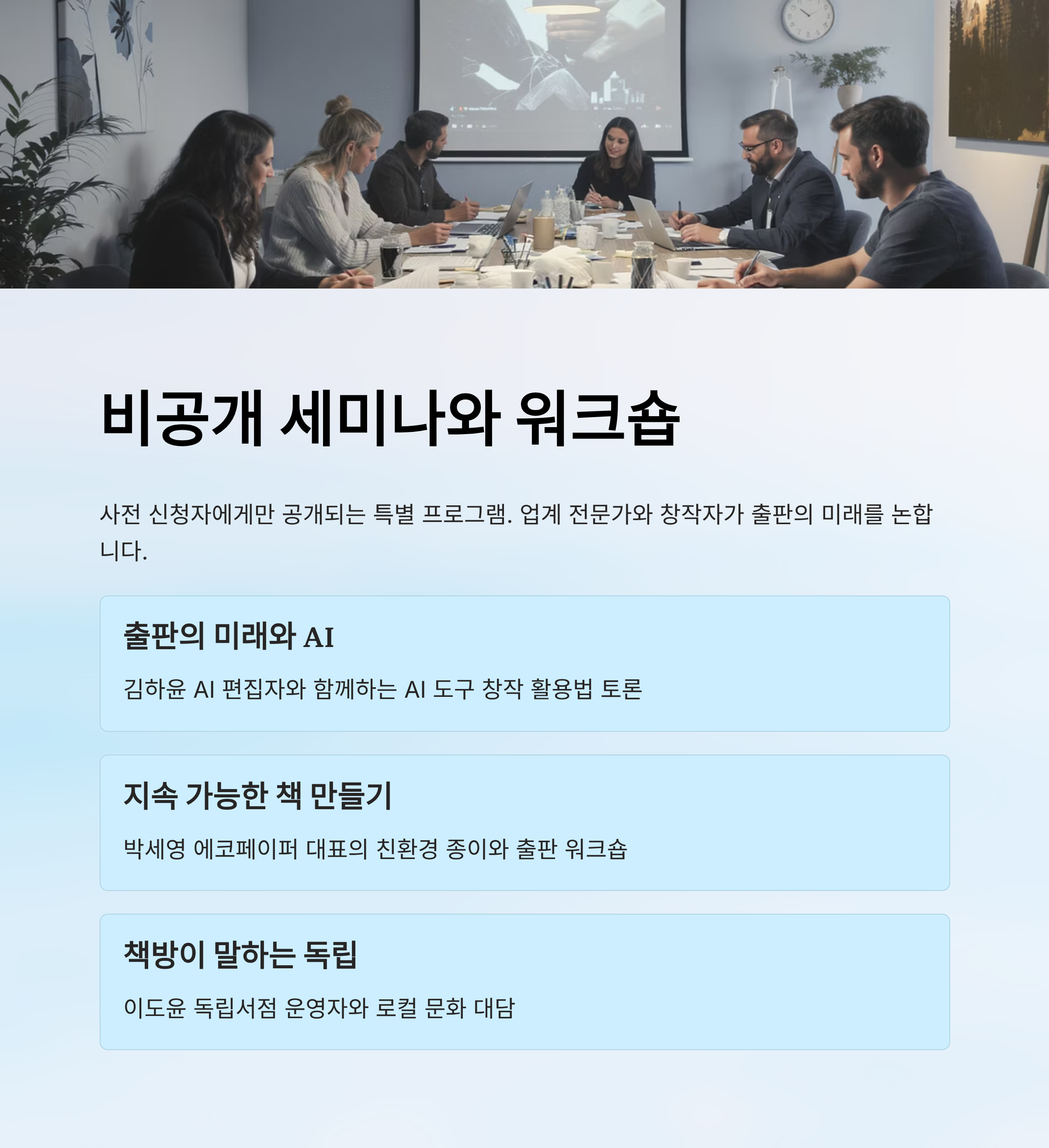 서울 퍼블리셔스 테이블이 가진 또 하나의 비밀스러운 매력은 바로 ‘비공개 세미나와 워크숍’이에요. 일반 관람객은 쉽게 접근할 수 없지만, 사전 신청자에게만 공개되는 이 프로그램은 업계 전문가와 창작자들이 진심 어린 대화를 나누는 자리예요. 🗝️