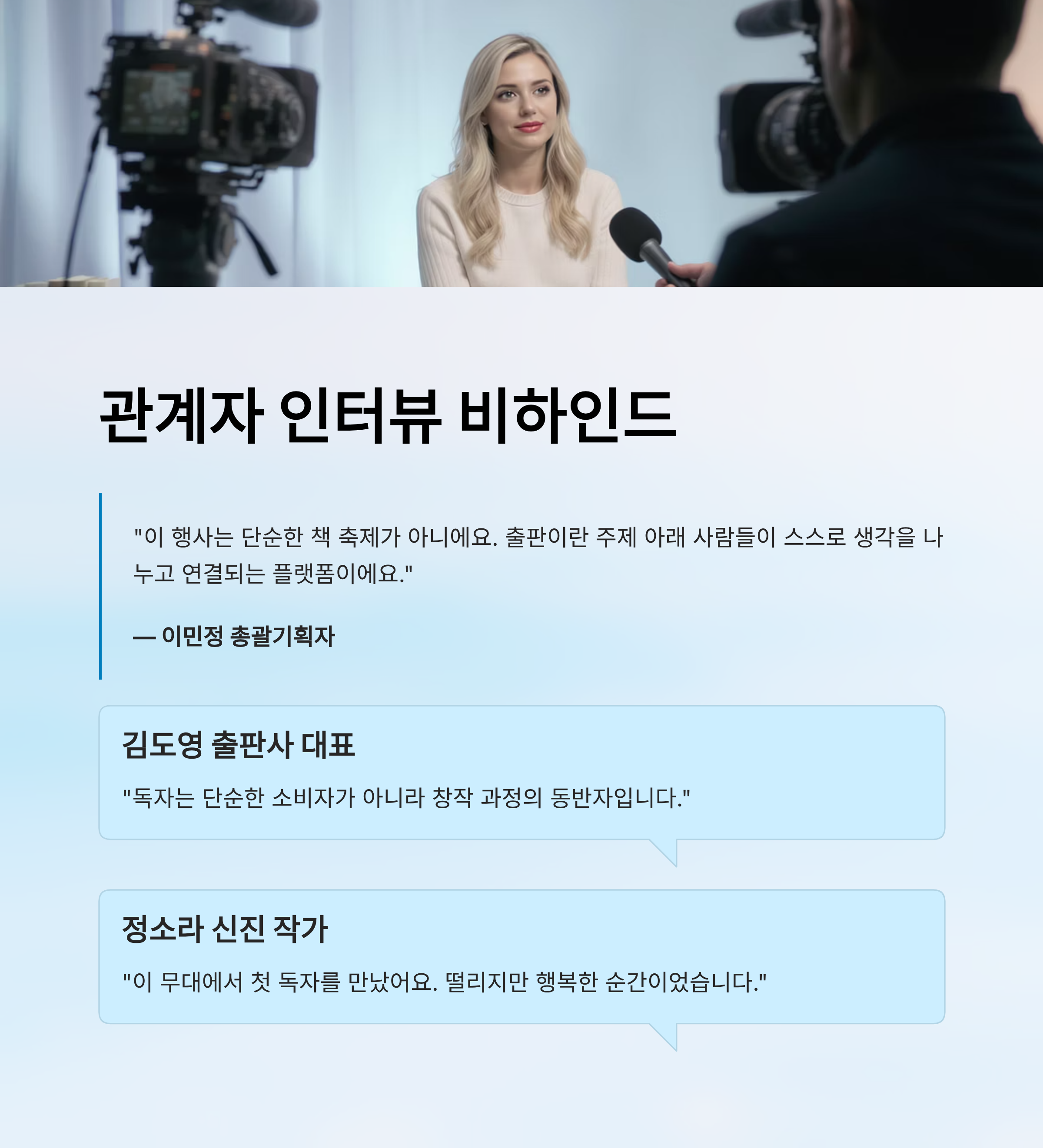 서울 퍼블리셔스 테이블의 현장을 진짜로 이해하려면, 그 안에서 뛰는 사람들의 이야기를 들어봐야 해요. 그래서 이번에는 행사 기획자, 출판사 대표, 그리고 첫 참가 신진 작가의 생생한 인터뷰를 담았어요. 그들의 시선 속에서 우리가 미처 보지 못한 ‘행사의 속살’을 엿볼 수 있었답니다. 🎧