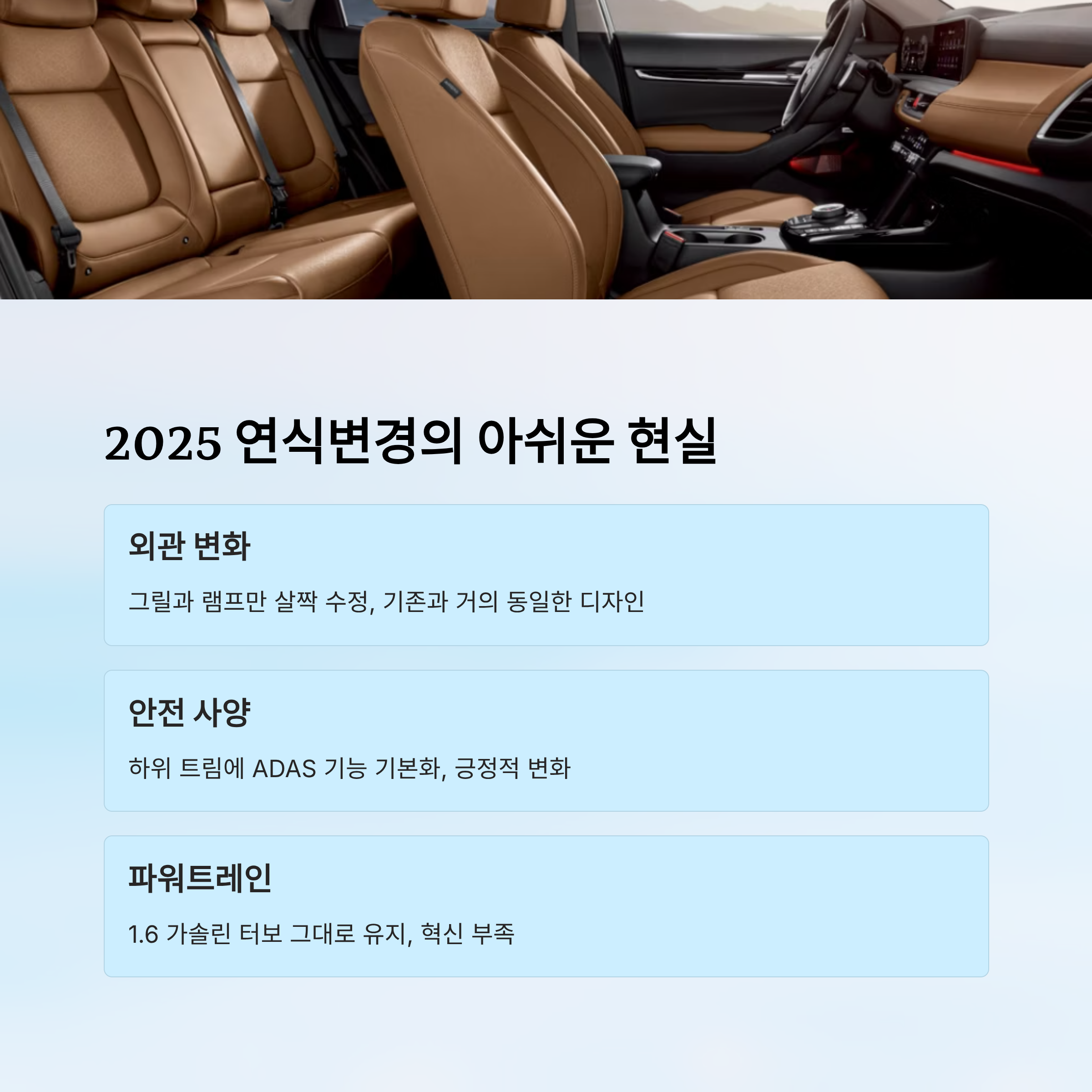 기술과 디자인 측면에서 보면, 2025 연식변경 모델을 지금 구매하는 것보다 하이브리드 풀체인지를 기다리는 것이 ‘스마트한 선택’처럼 느껴질 수밖에 없어요.