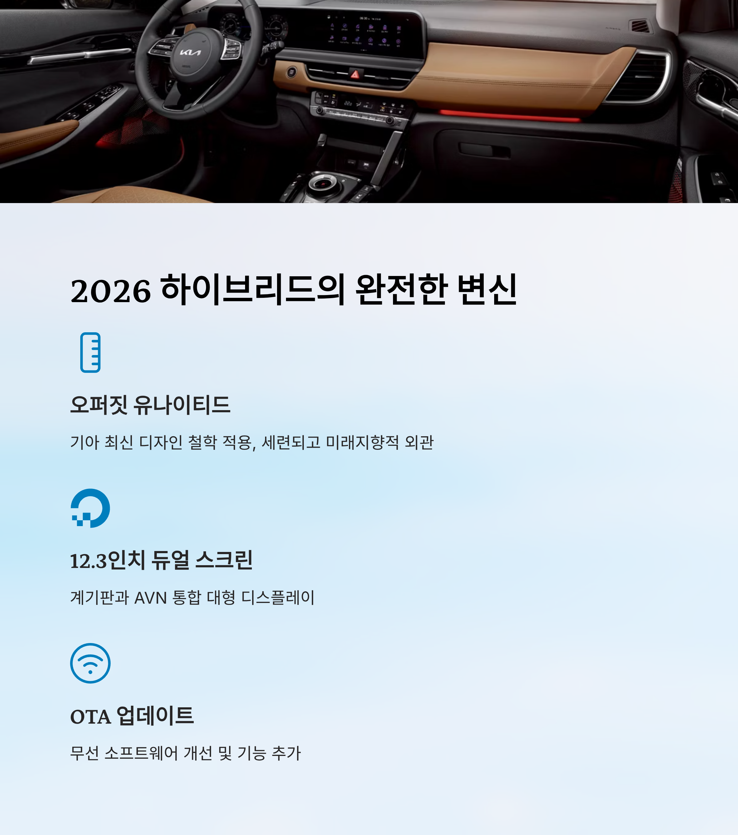 내부는 더 큰 변화를 겪을 예정이에요. 12.3인치 듀얼 와이드 스크린이 기본 적용되고, 기아 최초로 전자식 칼럼 기어, 공조 인터페이스 개선, OTA(무선 소프트웨어 업데이트) 지원 등 최신 기술들이 대거 탑재될 거예요.
