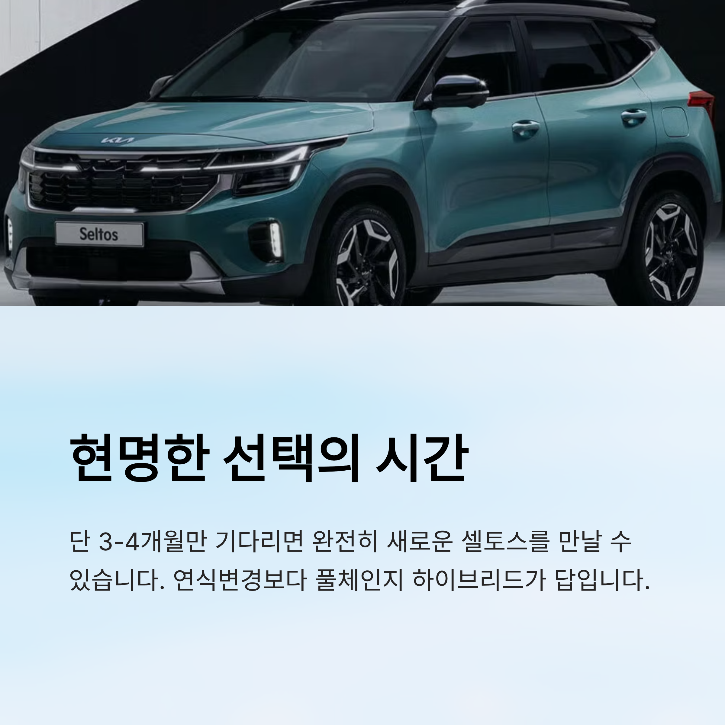 지금 셀토스를 계약할까 고민 중이라면, 하이브리드 풀체인지 모델의 공식 이미지가 나올 때까지 단 3~4개월만 기다려보는 건 어떨까요? 현명한 소비자라면 절대 놓치지 않을 타이밍이에요!