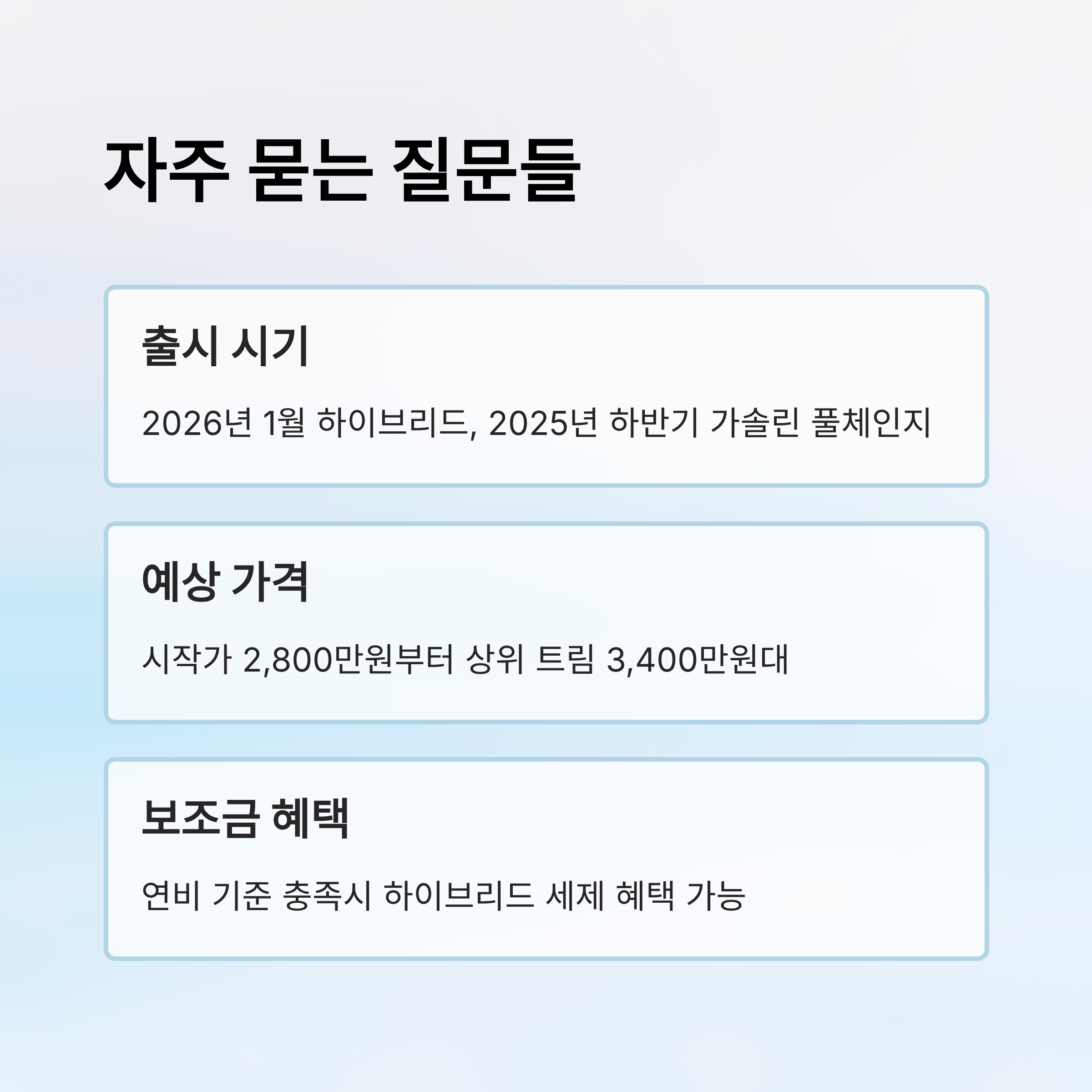 A1. 2026년 1월로 출시가 유력하며, 가솔린 풀체인지 모델은 2025년 하반기 출시 예정이에요.