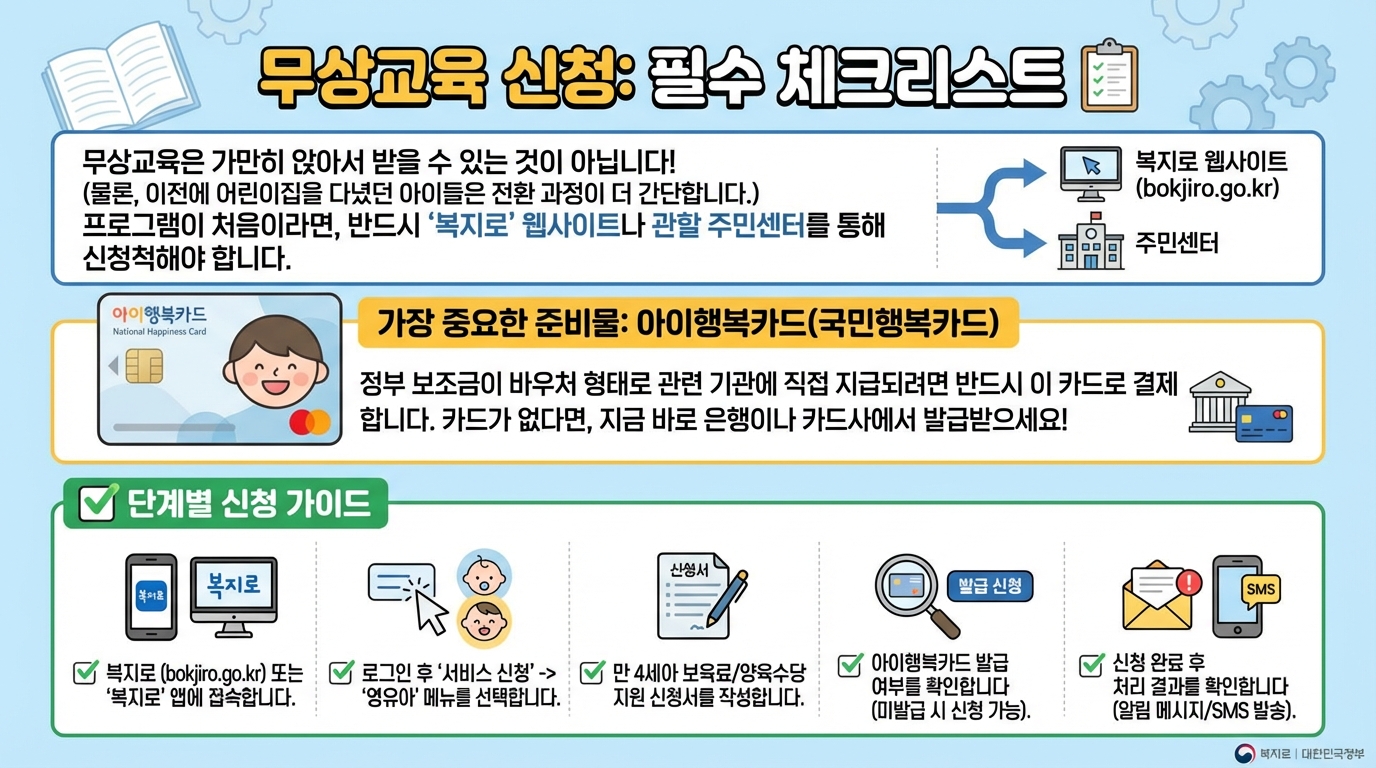무상교육은 가만히 있으면 알아서 지원되는 게 아닙니다! (물론 기존에 어린이집을 다니던 아이들은 전환 절차가 간소하지만요.) 신규 대상자라면 반드시 **'복지로'** 사이트나 주민센터를 통해 신청하셔야 해요.